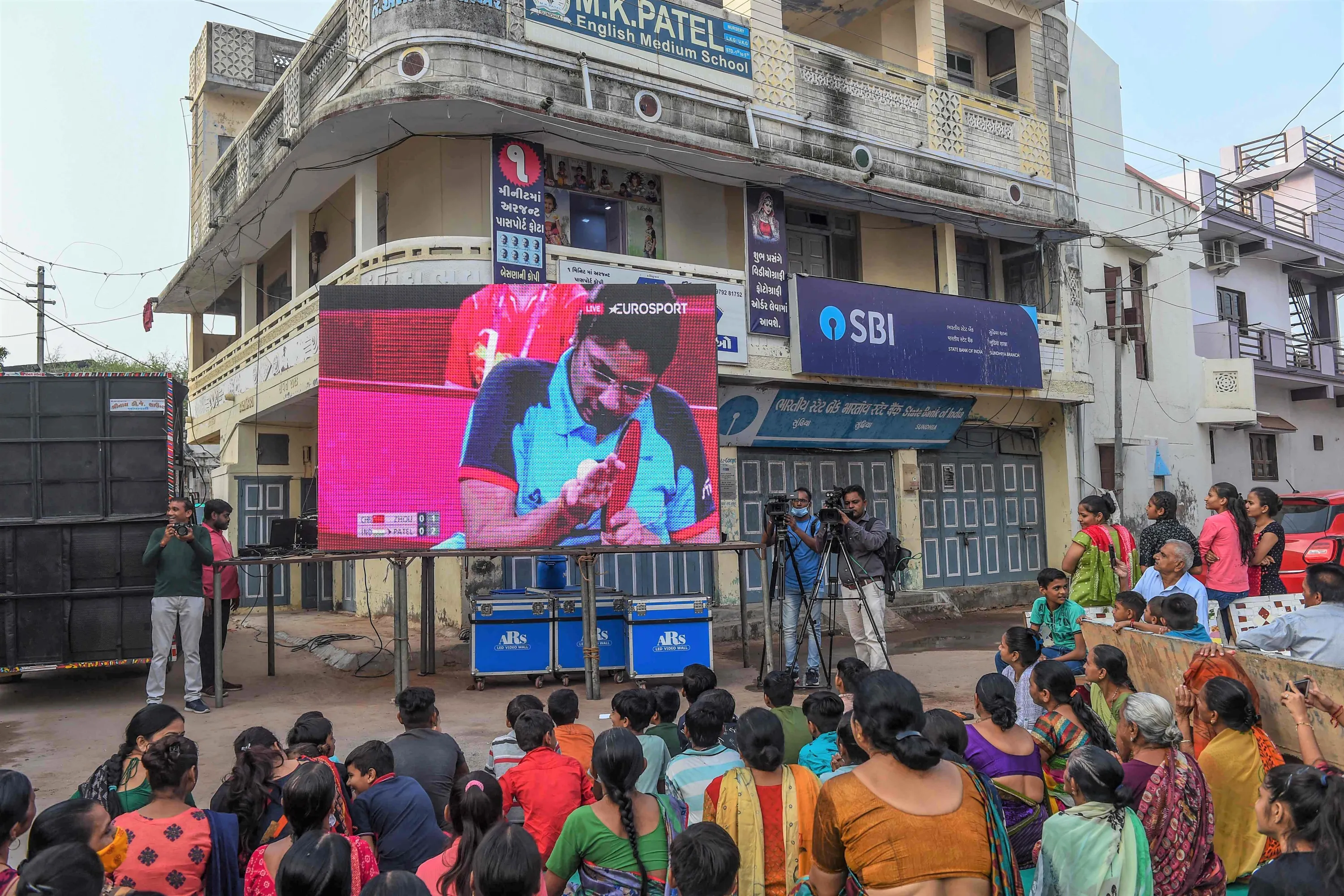 Villagers cheer as they watch the live telecast of the women's singles table tennis (class 4) match between India's Bhavinaben Patel and China's Ying Zhou at the Tokyo 2020 Paralympic Games on a large screen installed at a street intersection in the village Sundhia, about 100 kms from Ahmadabad on August 29, 2021. (Photo by Sam Panthaky/AFP Photo)