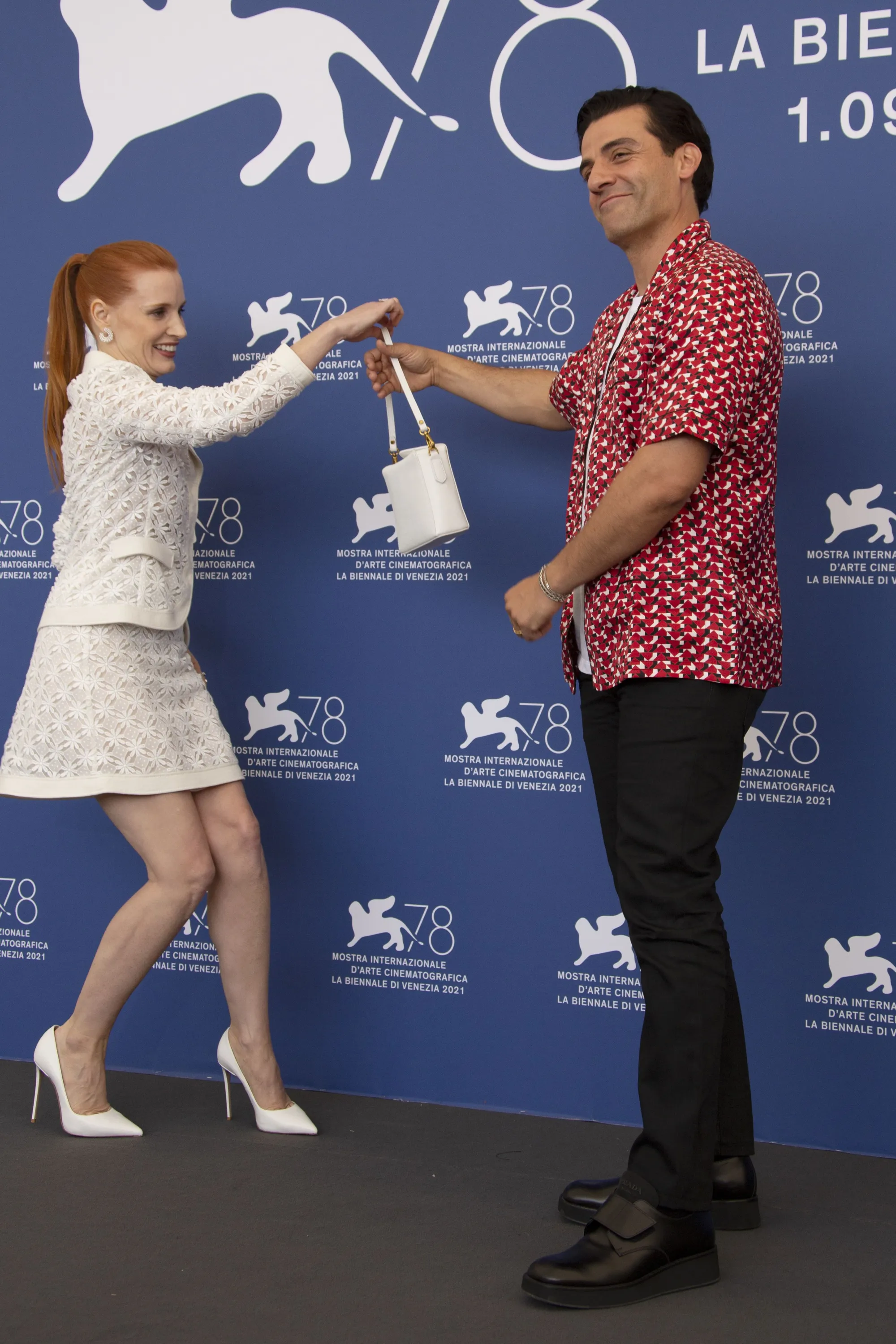 US actor Oscar Isaac and US actress Jessica Chastain attend a photocall for the film “Scenes from a Marriage” presented out of competition on September 4, 2021 during the 78th Venice Film Festival at Venice Lido. (Photo by Joel C Ryan/Invision/AP Photo)