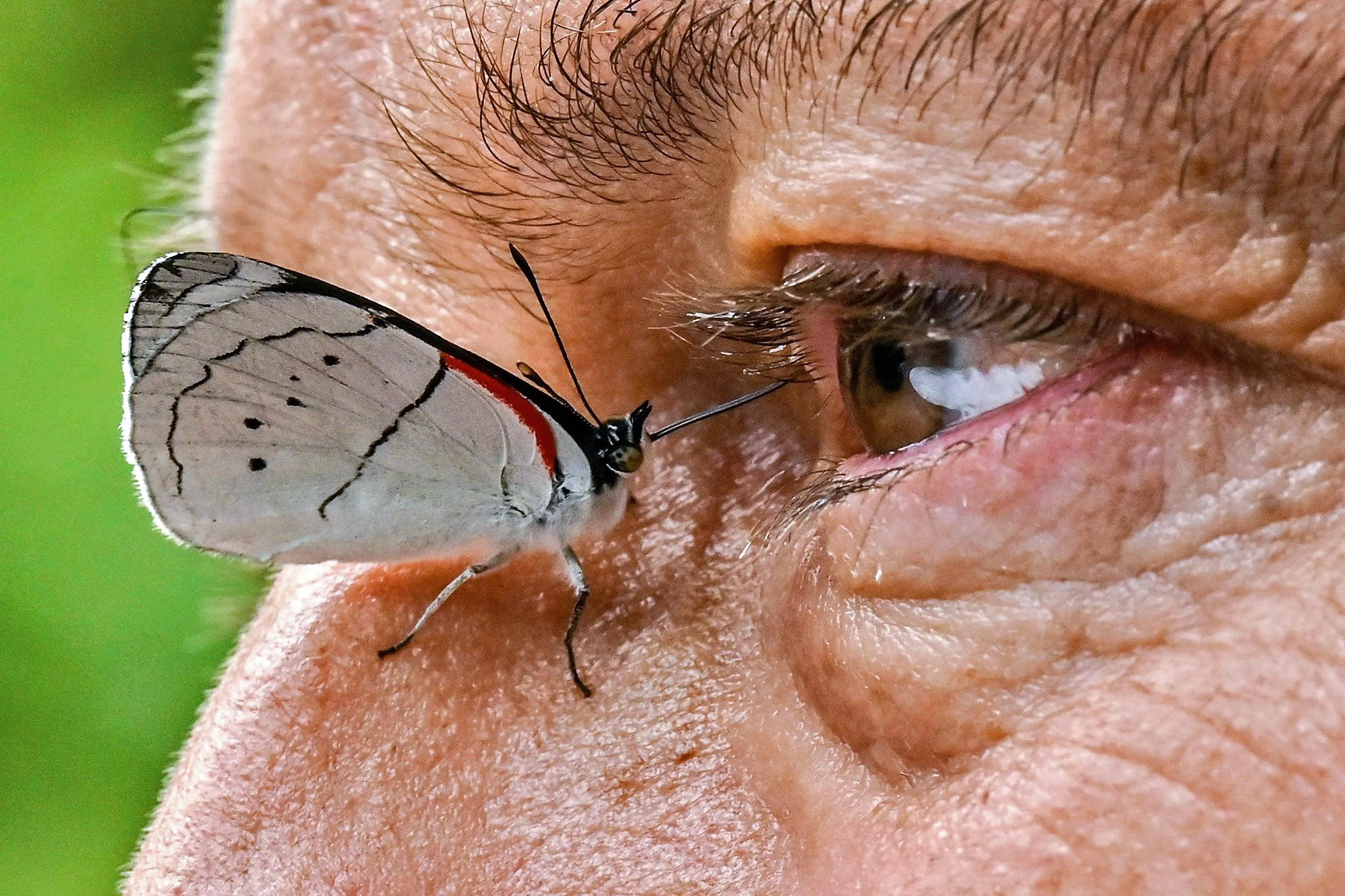 A butterfly is pictured next to the eye of Colombian photographer Juan Guillermo Jaramillo in Jardin, Antioquia department, Colombia on August 19, 2021. Colombian agronomist Juan Guillermo Jaramillo, 65, is the co-author of an inventary that certified Colombia as the country with the largest number of butterfly species in the world. (Photo by Joaquin Sarmiento/AFP Photo)