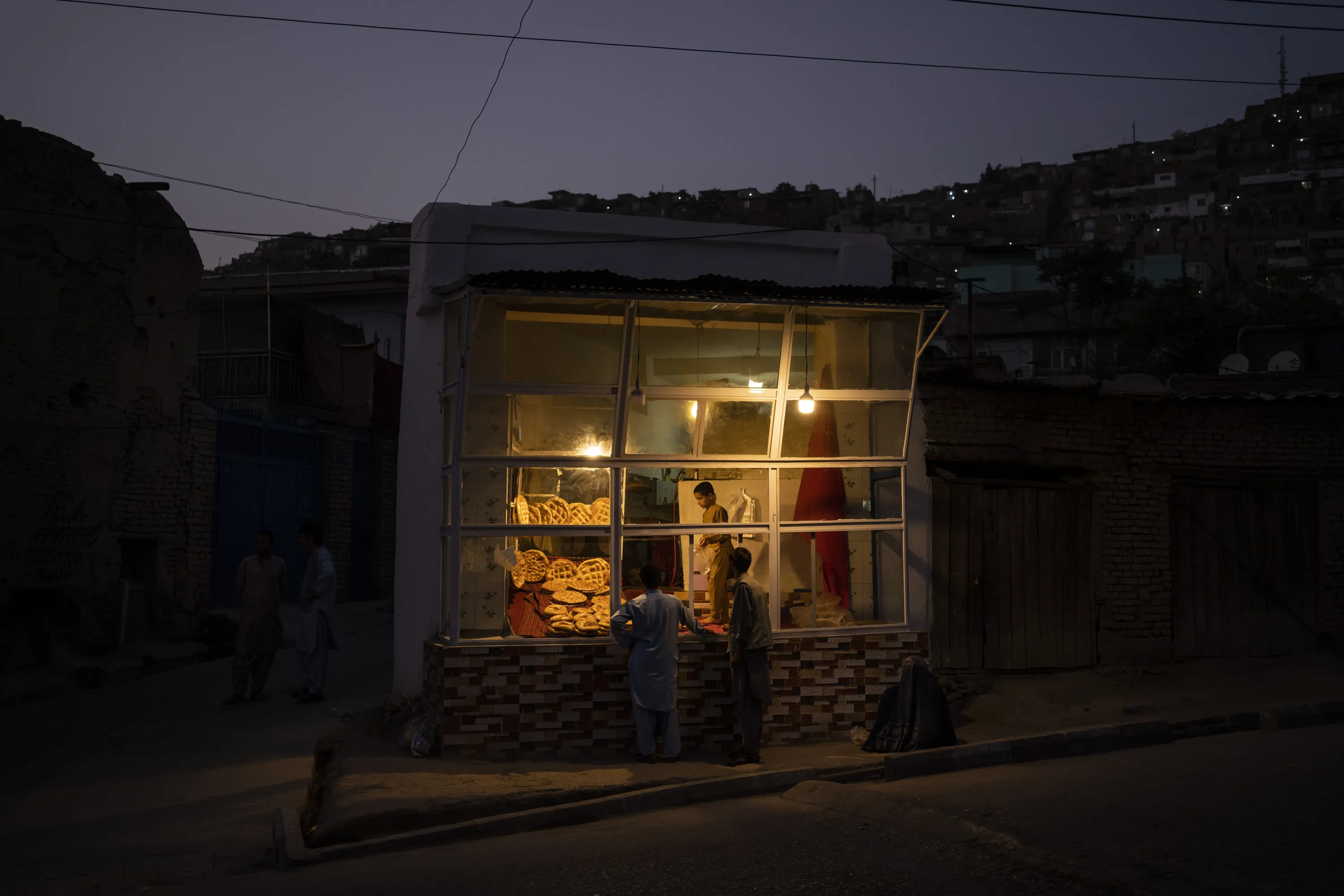Customers wait outside a small bakery at dusk in Kabul, Afghanistan, Friday, September 10, 2021. (Photo by Bernat Armangue/AP Photo)