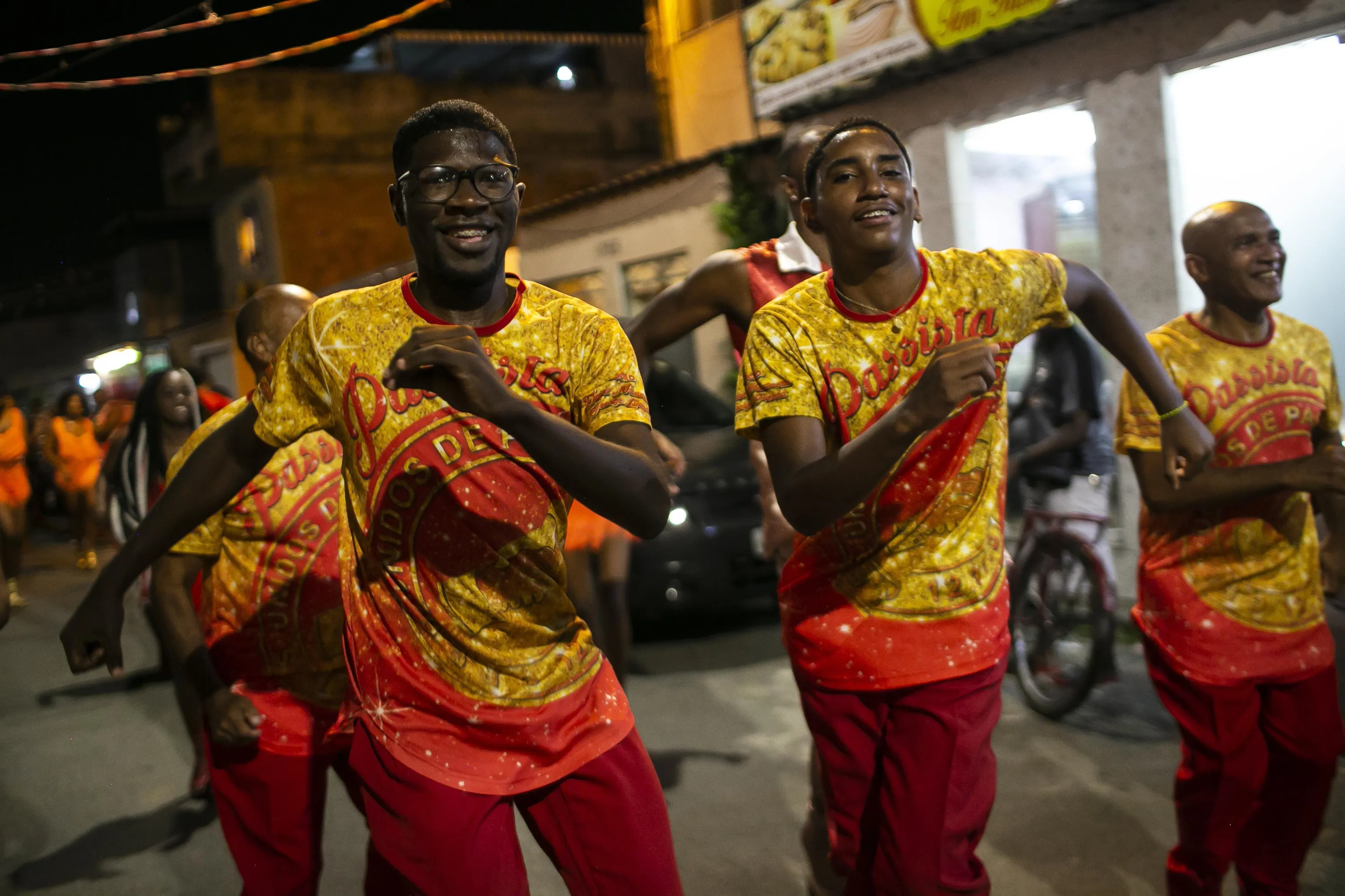 Men dance during a rehearsal by the Unidos de Padre Miguel samba school in Rio de Janeiro, Brazil, Tuesday, September 28, 2021. The Unidos de Padre Miguel samba school is already preparing for next year's carnival, rehearsing with some members without public participation. (Photo by Bruna Prado/AP Photo)