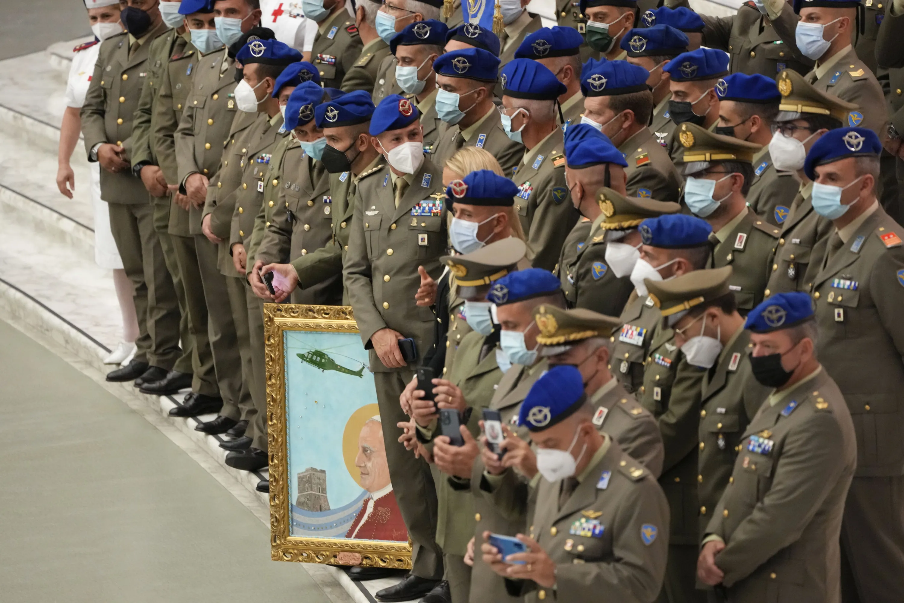 A group of Italian army officers line up to have a group photo taken with Pope Francis at the end of his weekly general audience in the Pope Paul VI hall at the Vatican, Wednesday, October 6, 2021. (Photo by Alessandra Tarantino/AP Photo)
