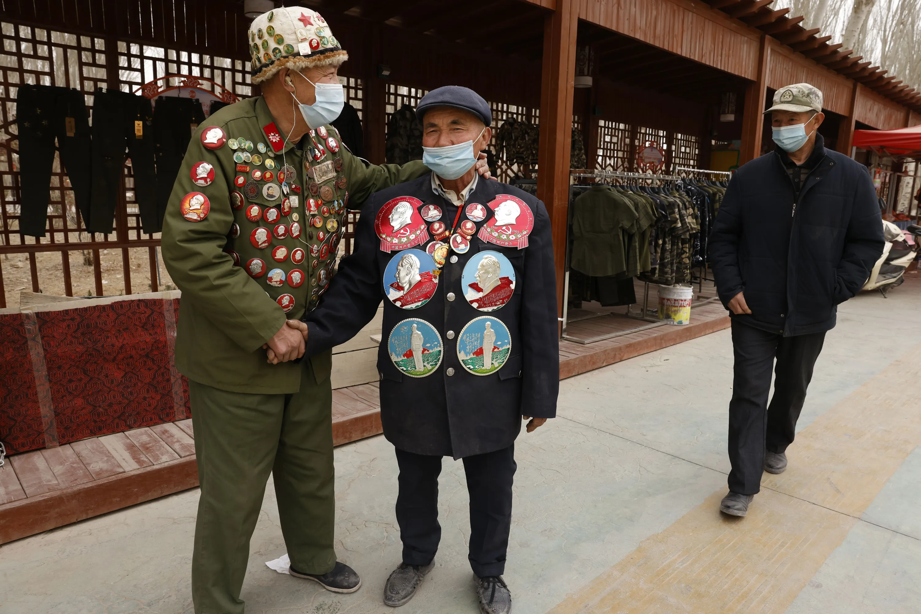 Ethnic minority veterans wearing commemorative buttons, some featuring Chairman Mao Zedong, greet each other at a flea market in Poksam county in northwestern China's Xinjiang Uyghur Autonomous Region on March 21, 2021. Four years after Beijing's brutal crackdown on largely Muslim minorities native to Xinjiang, Chinese authorities are dialing back the region's high-tech police state and stepping up tourism. But even as a sense of normality returns, fear remains, hidden but pervasive. (Photo by Ng Han Guan/AP Photo)