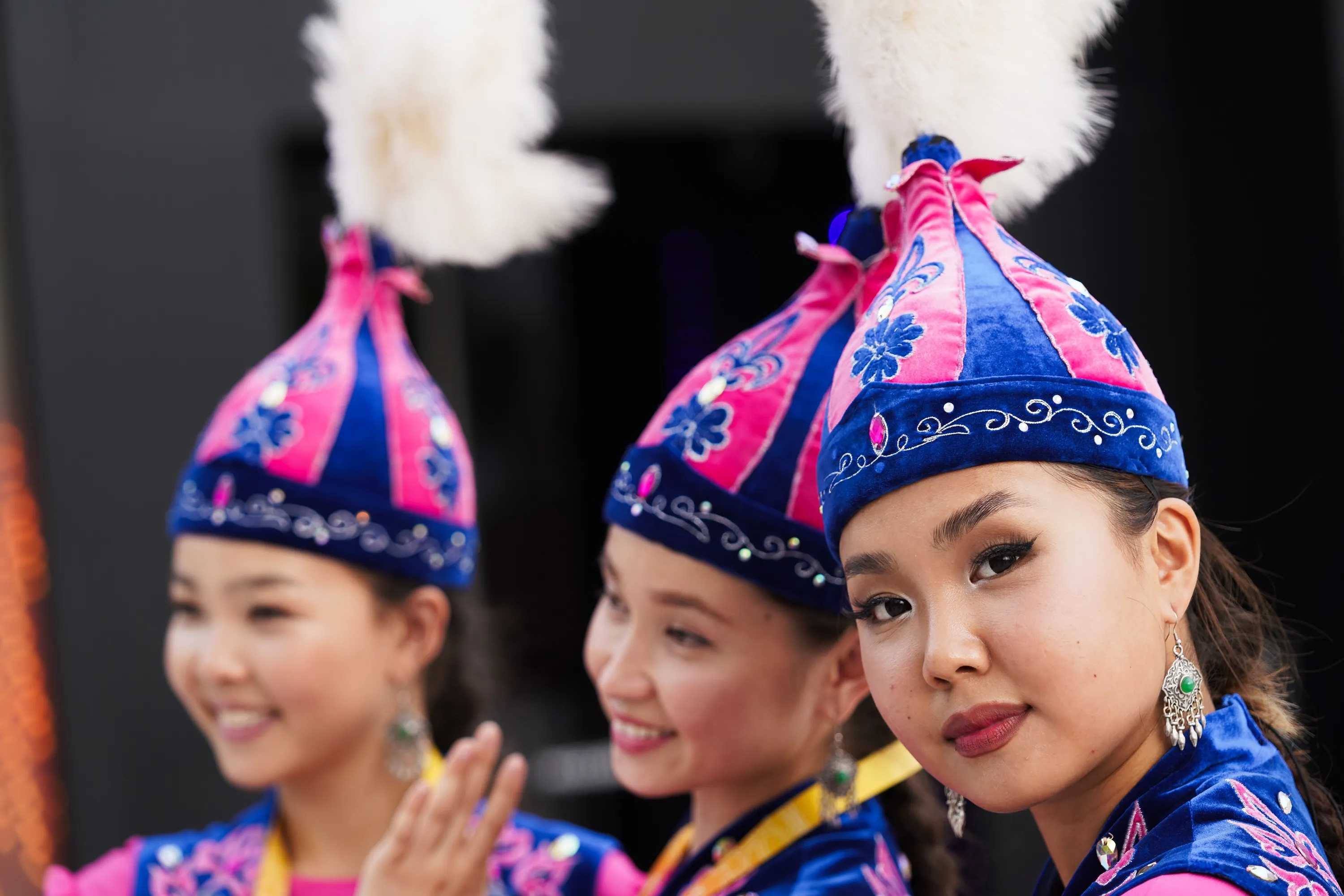 Performers from Kazakhstan's pavilion pose for photographs at Expo 2020, in Dubai, United Arab Emirates, Sunday, October 3, 2021. (Photo by Jon Gambrell/AP Photo)