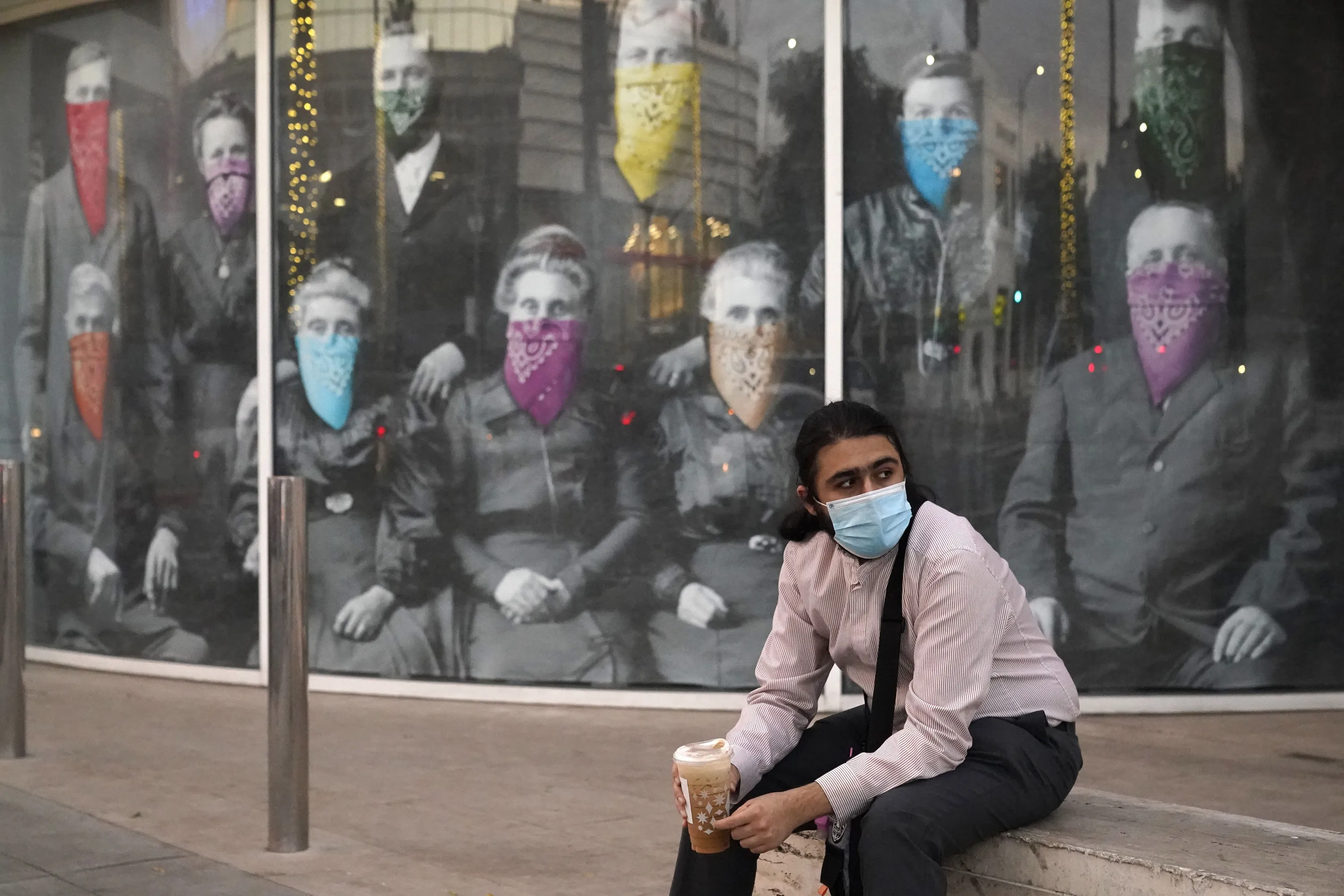 In this Wednesday, December 9, 2020, file photo, a man takes a coffee break in front of a COVID 19-themed mural, in Beverly Hills, Calif. On Monday, Oct. 11, 2021, California's coronavirus death toll reached 70,000. (Photo by Marcio Jose Sanchez/AP Photo/File)