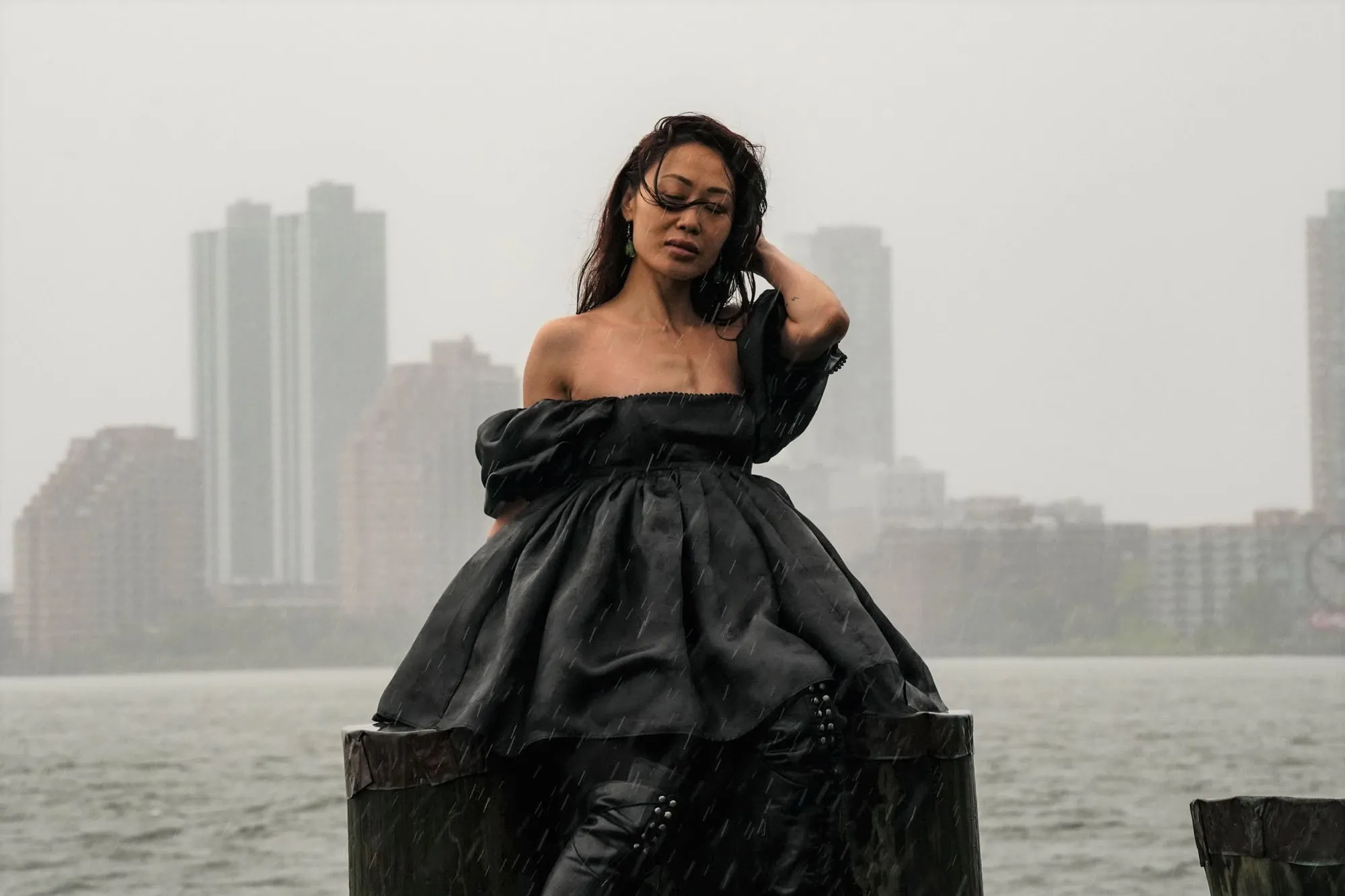 Sabrina Davi poses for photos in Battery Park during Tropical Storm Henri on August 22, 2021 in New York City. A federal storm warning was declared in parts of New England after Hurricane Henri was downgraded from a category 1 hurricane to a tropical storm on Sunday morning. (Photo by David Dee Delgado/Getty Images)