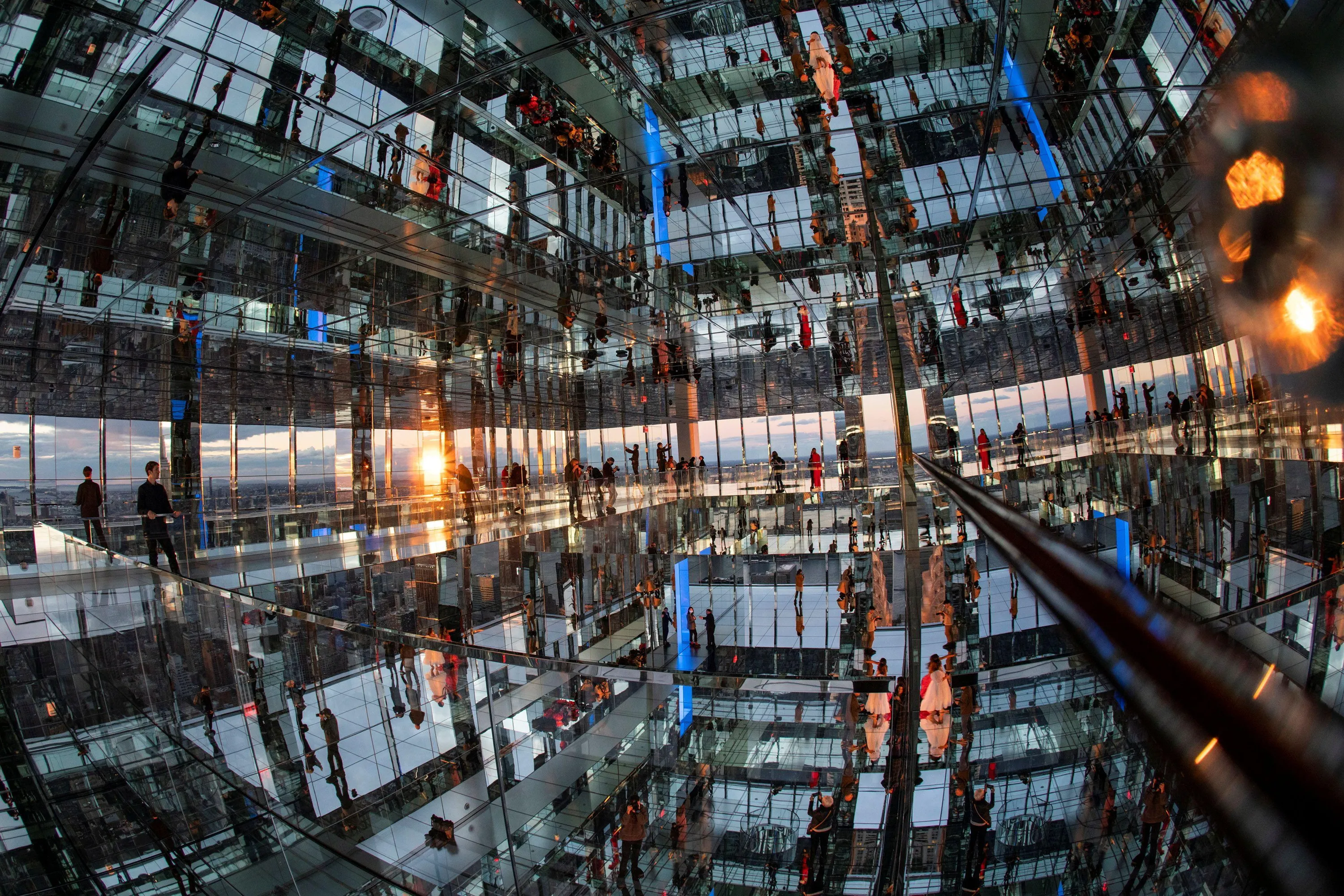 People enjoy the sunset and the New York Skyline view during a preview of SUMMIT One Vanderbilt observation deck, which is spread across the top four floors of the new One Vanderbilt tower in Midtown Manhattan, in New York City, New York, U.S., October 18, 2021. (Photo by Eduardo Munoz/Reuters)