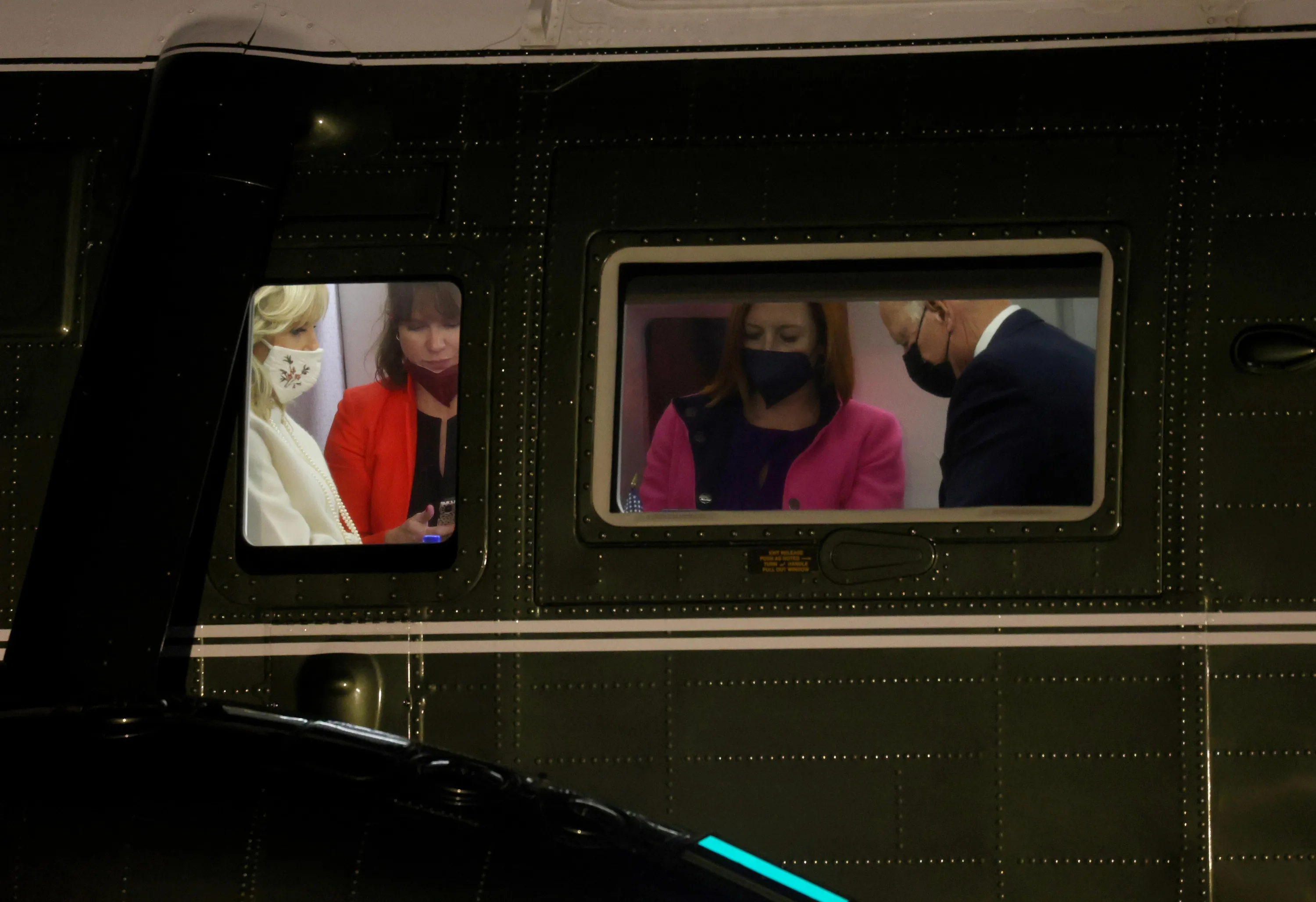U.S. President Joe Biden, First Lady Jill Biden, Press Secretary Jen Psaki, Assistant to the President and Director of Communications Kate Bedingfield and other staff take off in Marine One for travel to Baltimore from the South Lawn of the White House in Washington, U.S., October 21, 2021. (Photo by Leah Millis/Reuters)