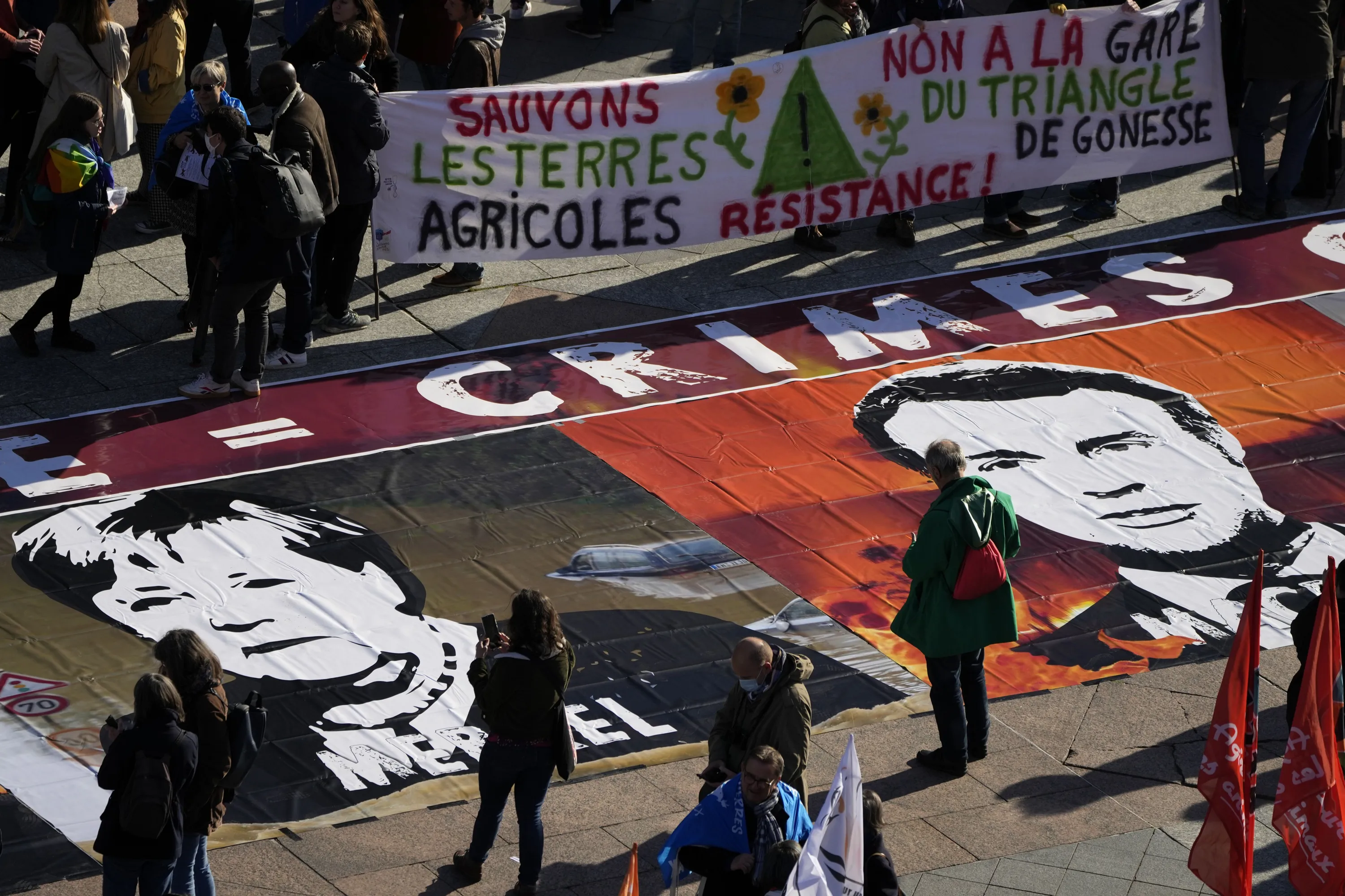 Portraits of world leaders, including portraits German Chancellor Angela Merkel, left, and French President Emmanuel Macron lay on the ground during a protest organized by green coalitions for the “Global Day for Climate” in front of Paris city Hall in Paris, France, Saturday, November 6, 2021. The protest is taking place as leaders and activists from around the world were gathering in Glasgow, Scotland for the U.N. climate summit, to lay out their vision for addressing the common challenge of global warming. (Photo by Francois Mori/AP Photo)