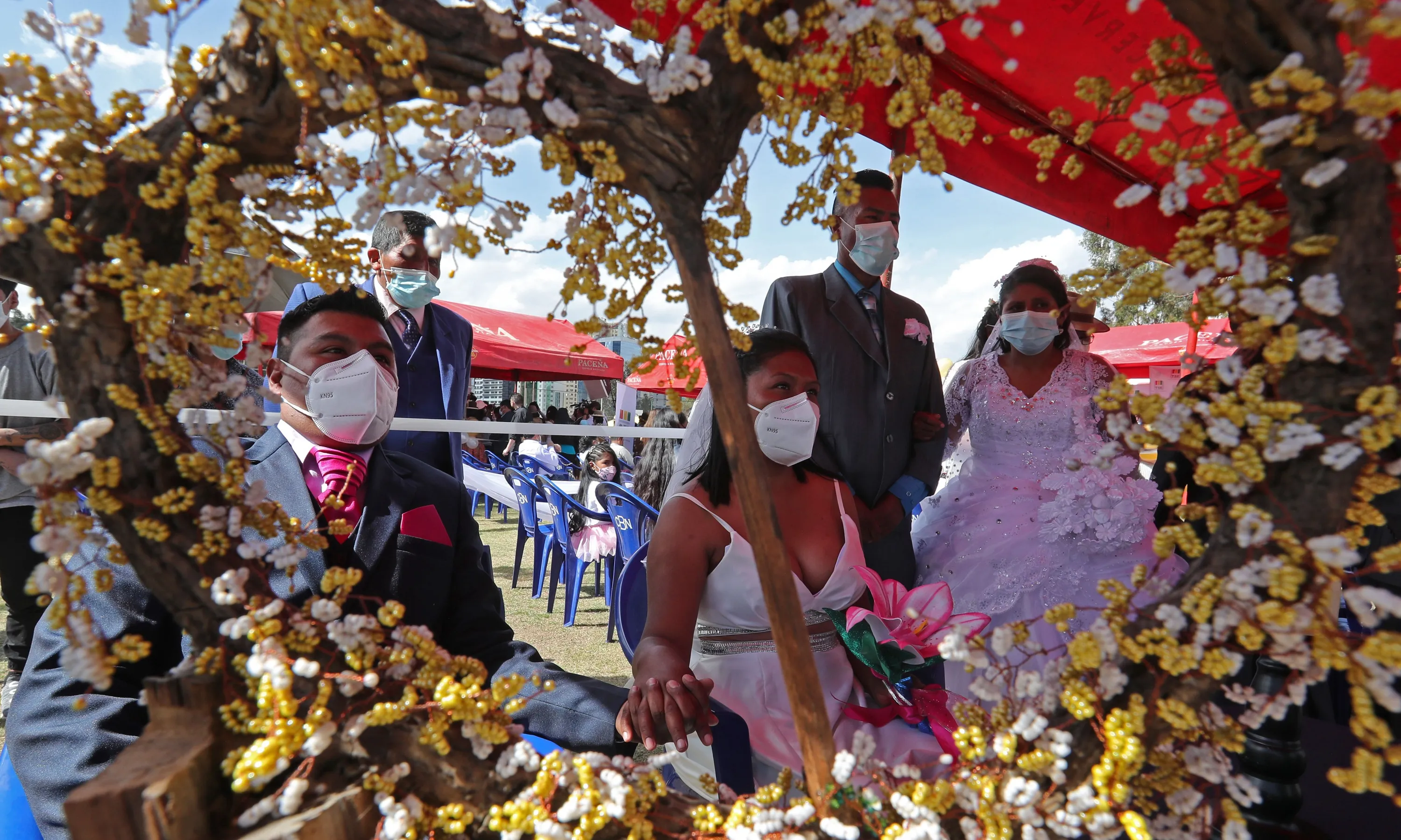 A couple gets married during a collective wedding by the Civil Registry Service (Sereci), in the Luis Lastra municipal court in La Paz, Bolivia, 06 November 2021. (Photo by Martin Alipaz/EPA/EFE)