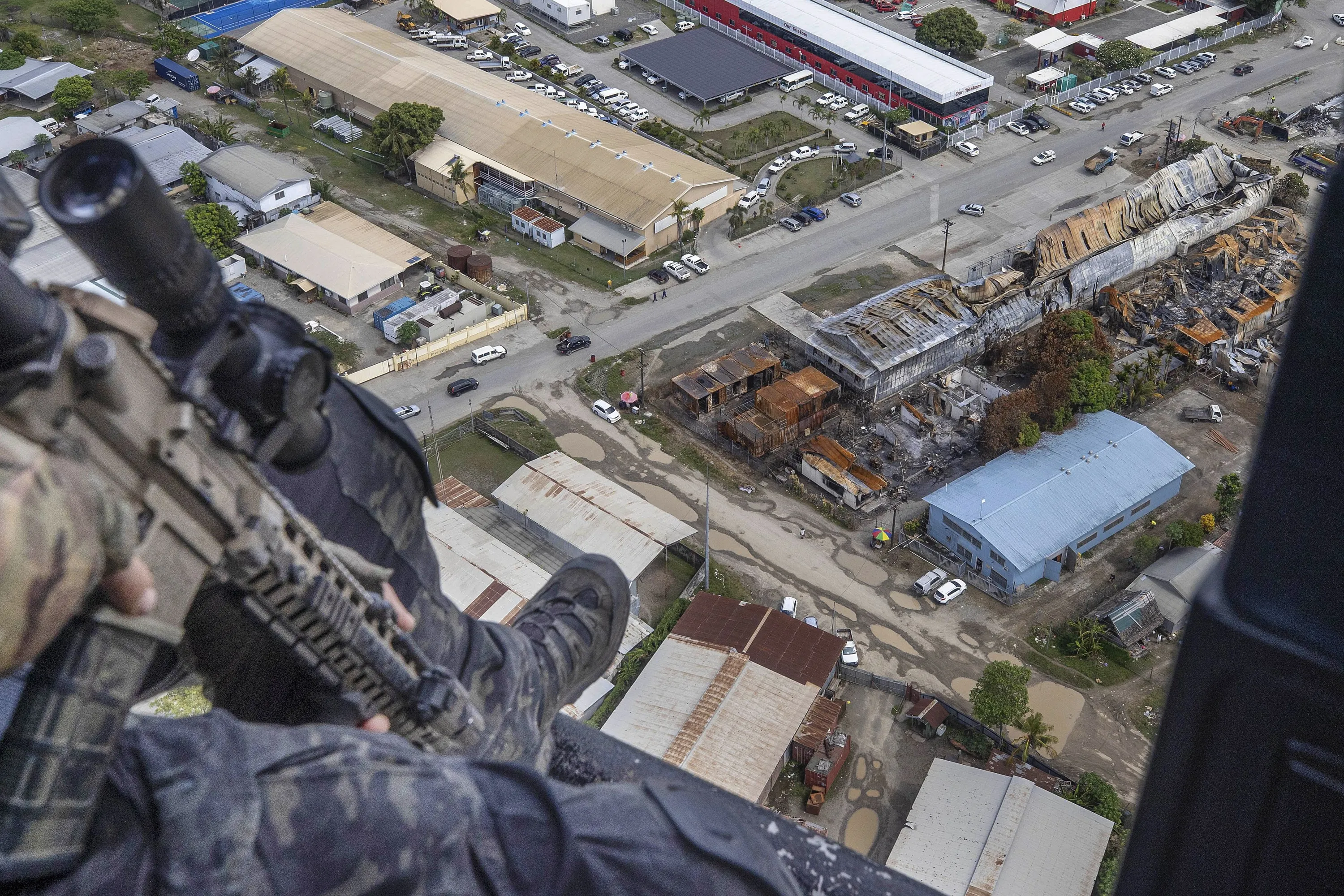 Australian Federal Police Tactical Response officer inspects the damage over the Chinatown area from the air during an operation in Honiara, Solomon Islands, Wednesday, December 1, 2021. New Zealand announced Wednesday that they will send up to 65 military and police personnel to the Solomon Islands over the coming days after rioting and looting broke out there last week. (Photo by Gary Ramage via AP Photo)