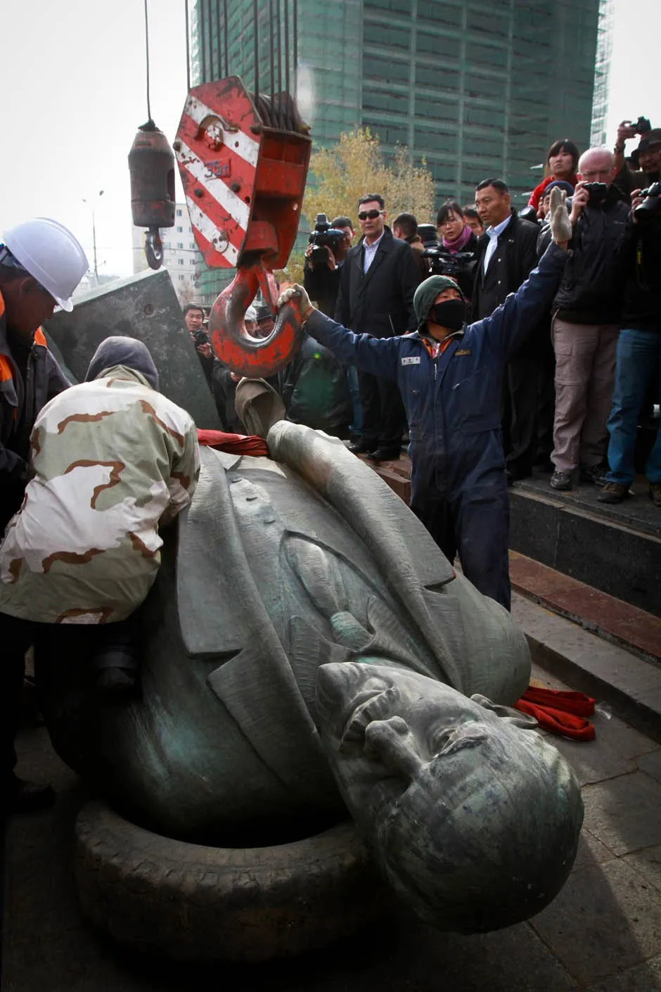 Workers take down the last bronze statue of Vladimir Lenin in the capital Ulan-Bator on October 14, 2012, after Mayor Bat-Uul Erdene denounced the communist leader as a “murderer”. For decades Vladimir Lenin was worshipped by Mongolian schoolchildren as Teacher Lenin. (Photo by Byambasuren Byamba-Ochir/AFP Photo)