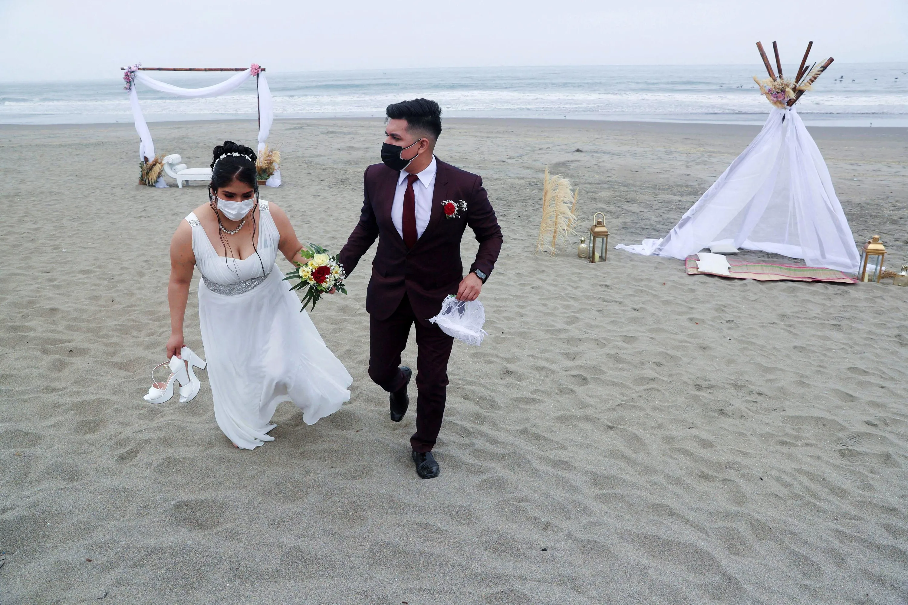 Couple leaves the beach after being married in a mass wedding in Lima, Peru on December 11, 2021. (Photo by Sebastian Castaneda/Reuters)
