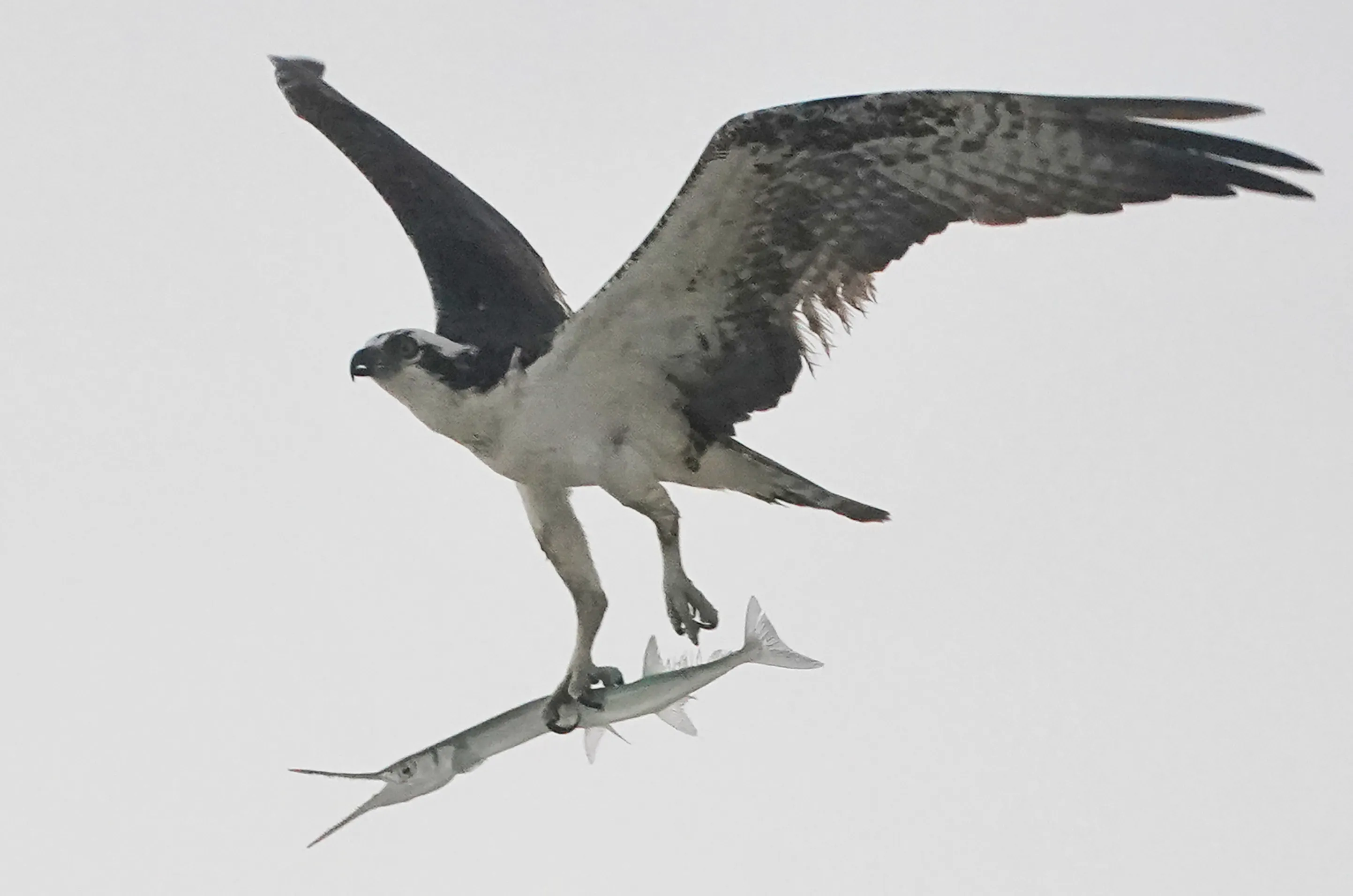 An osprey carries off a hound fish along the beach, Monday, December 13, 2021, in Surfside, Fla. (Photo by Wilfredo Lee/AP Photo)