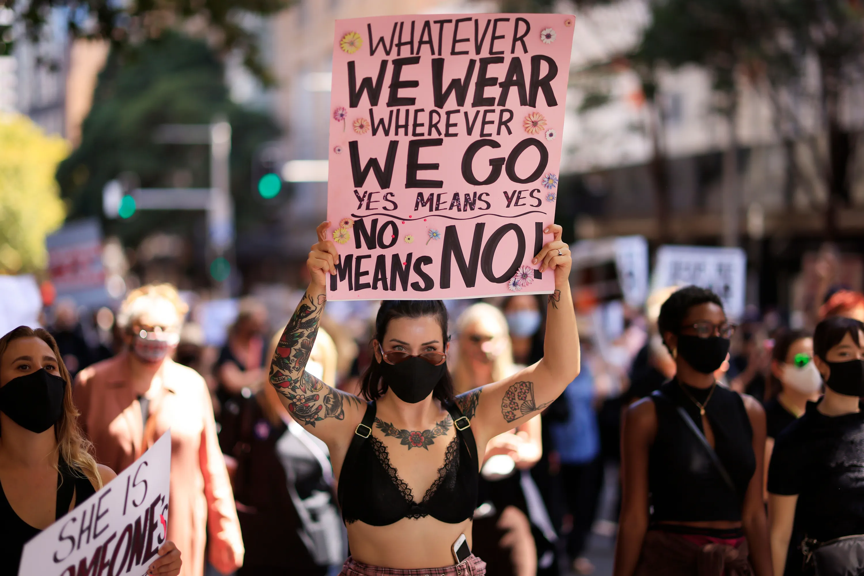 Women march from Town Hall on March 15, 2021 in Sydney, Australia. Thousands are expected at “March 4 Justice” rallies across Australia calling for action against gendered violence in Parliament as news of the alleged rape of former Brittany Higgins at Parliament House and allegations that Attorney-General Christian Porter raped a 16-year-old girl when he was 17 in 1988 continue to cause outrage. (Photo by Mark Evans/Getty Images)