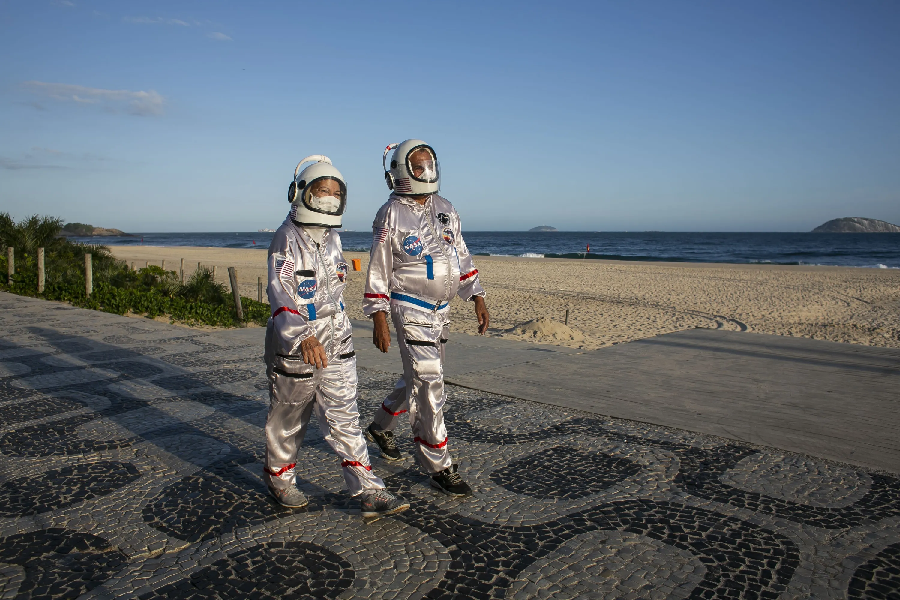 Accountant Tercio Galdino and wife Alicea walk in astronaut costumes as a way to protect themselves from COVID-19 and draw awareness to protective measures along Ipanema beach in Rio de Janeiro, Brazil, Saturday, March 20, 2021. The pair first began to traverse the iconic beaches fully suited in mid 2020 at the height of the first wave of the pandemic in Brazil, and now as cases surge once again they are taking their “astronaut walks” back to the promenades. (Photo by Bruna Prado/AP Photo)