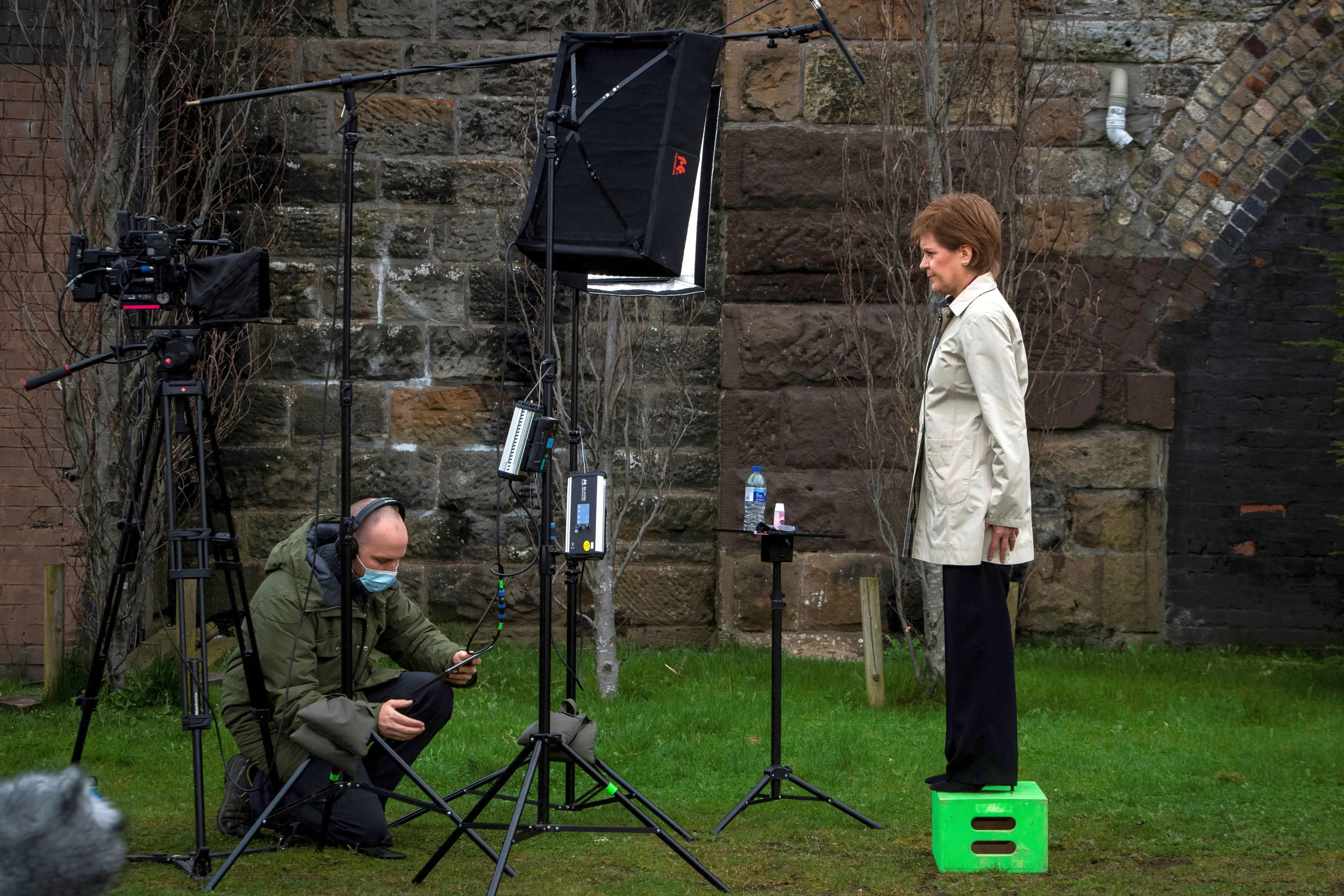 Scotland's First Minister and leader of the Scottish National Party (SNP), Nicola Sturgeon waits for the camera technician as she launches the SNP virtual electoral campaign in Partick in the West End of Glasgow, Scotland on March 31, 2021, ahead of the upcoming Scottish Parliament election which is to be held on May 6, 2021. (Photo by Andy Buchanan/Pool via AFP Photo)