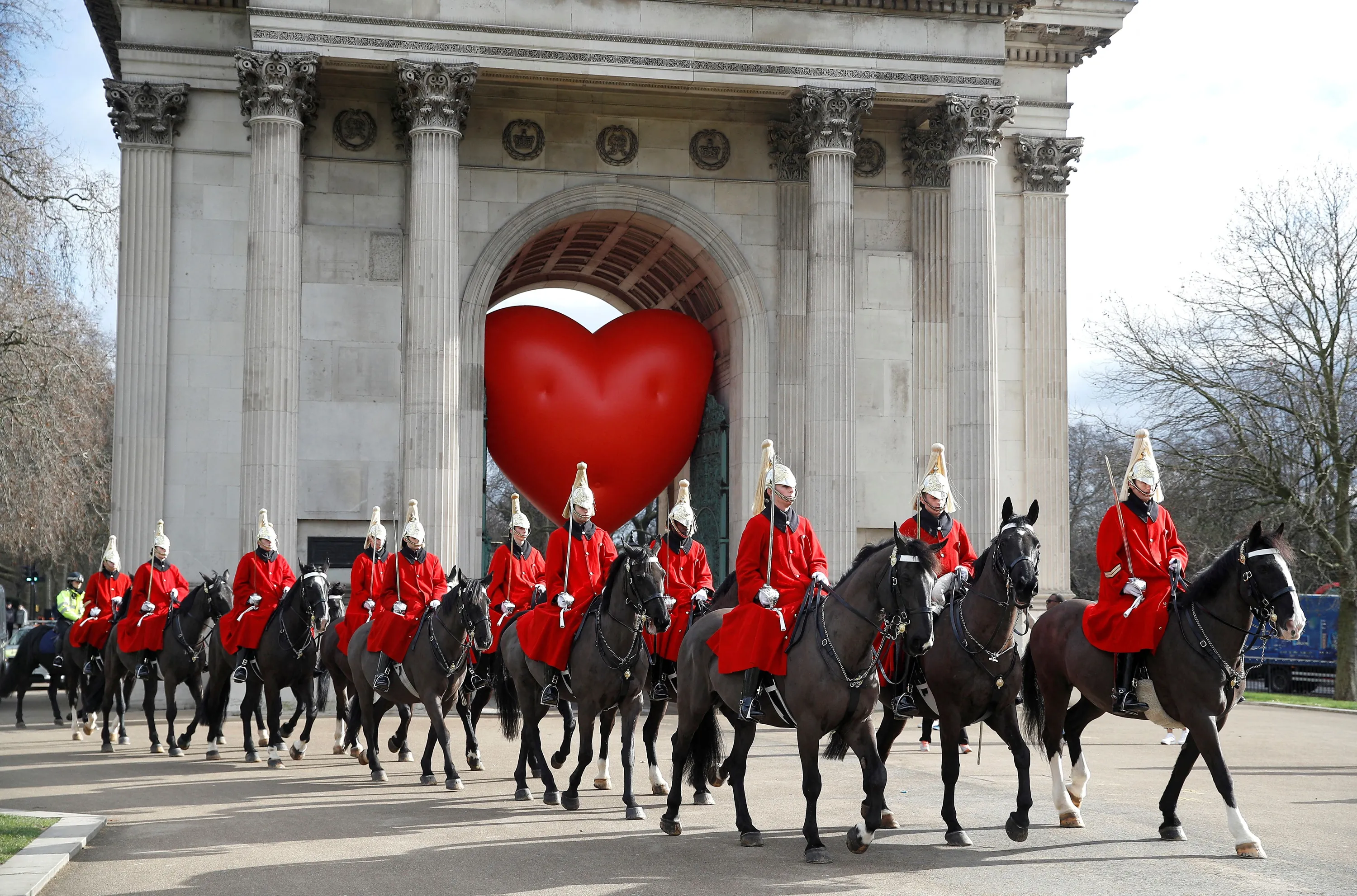 Members of the Household Cavalry walk past Wellington Arch and a large inflatable heart, on Valentine's Day in London, Britain, February 14, 2022. (Photo by Peter Nicholls/Reuters)