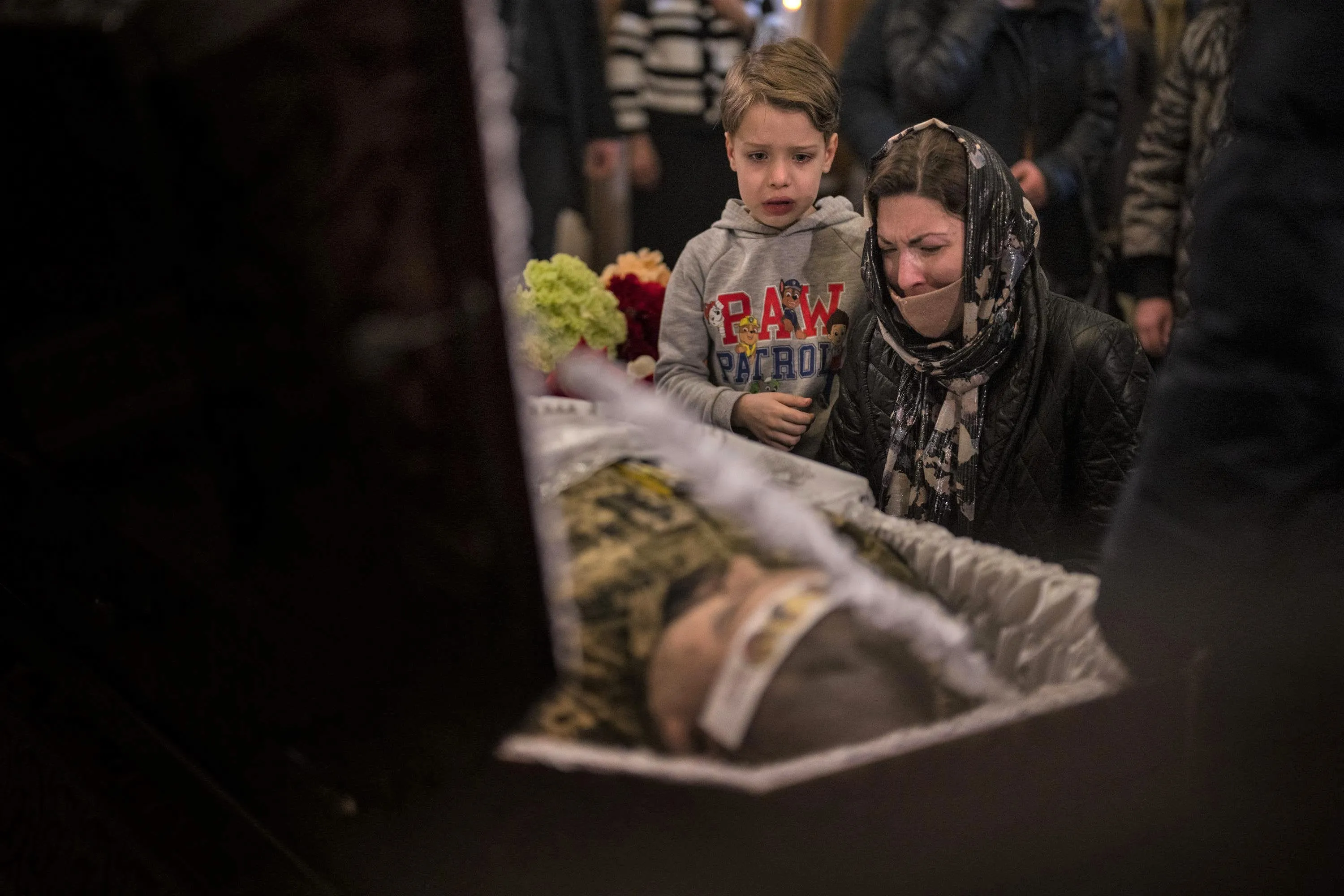 A woman and a boy react next to the body of Ukrainian Army captain Anton Sydorov, 35, killed in eastern Ukraine, during his funeral, in Kyiv, Ukraine, Tuesday, February 22, 2022. Western leaders said Tuesday that Russian troops have moved into rebel-held areas in eastern Ukraine after President Vladimir Putin's recognized their independence – but some indicated it was not yet the long-feared full-fledged invasion as confusion reigned in the region. (Photo by Emilio Morenatti/AP Photo)