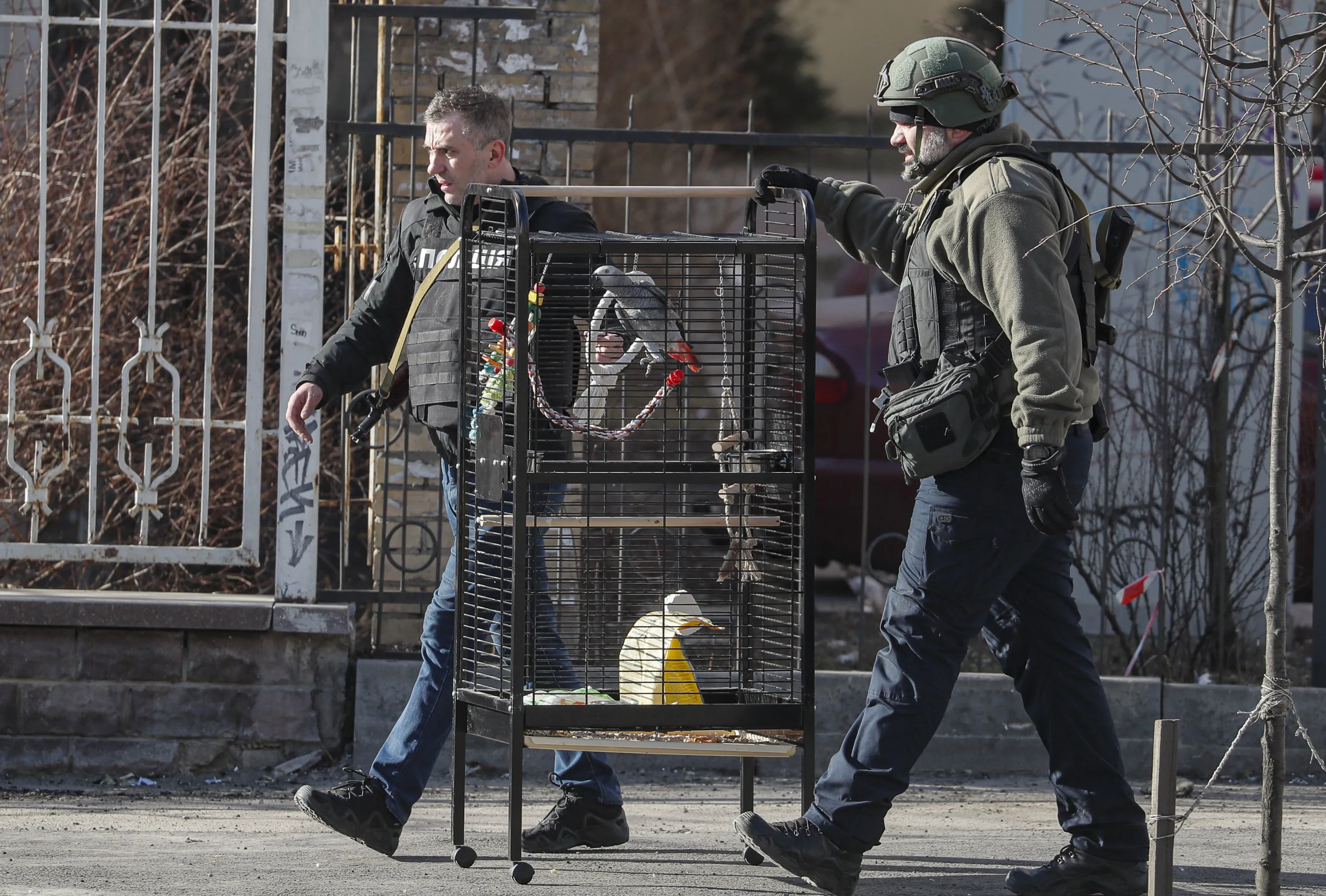 Ukrainian policemen evacuate parrots after a high-rise apartment block was damaged by shelling in Kiev, Ukraine, 26 February 2022. Russian President Vladimir Putin announced a 'special military operation' in the Donbass with the aim, as he put it, of demilitarizing and denazifying Ukraine, as well as bringing to justice those who committed numerous bloody crimes against civilians. Martial law has been introduced in Ukraine, explosions are heard in many cities, including Kiev. (Photo by Sergey Dolzhenko/EPA/EFE)
