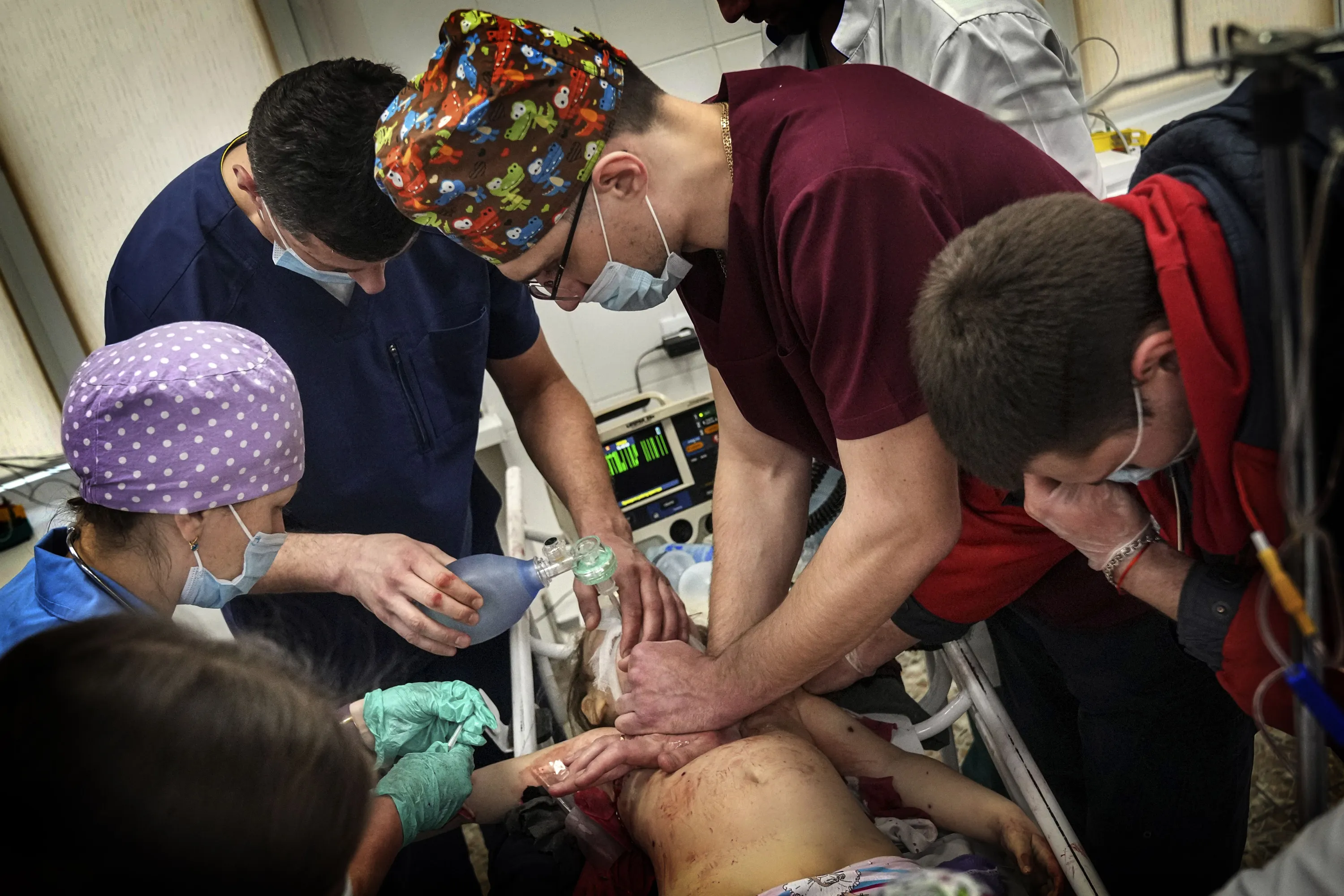 Medics perform CPR on a girl at the city hospital of Mariupol, who was injured during shelling in a residential area in eastern Ukraine, Sunday, February 27, 2022. The girl did not survive. (Photo by Evgeniy Maloletka/AP Photo)