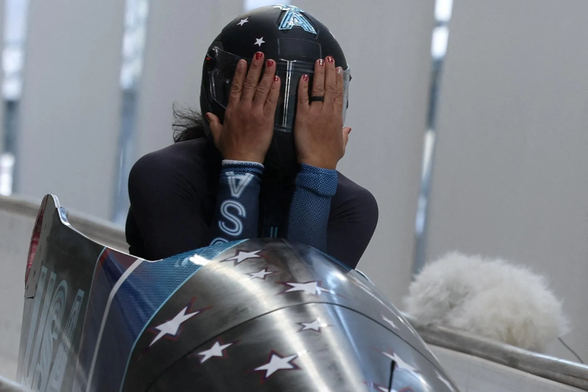 U.S. bobsleigh racer Elana Meyers Taylor gets emotional after her final monobob run at the Beijing Winter Olympics on Feb. 14, 2022, at the National Sliding Centre in the Yanqing competition zone. She took silver. (Photo by Edgar Su/Reuters)