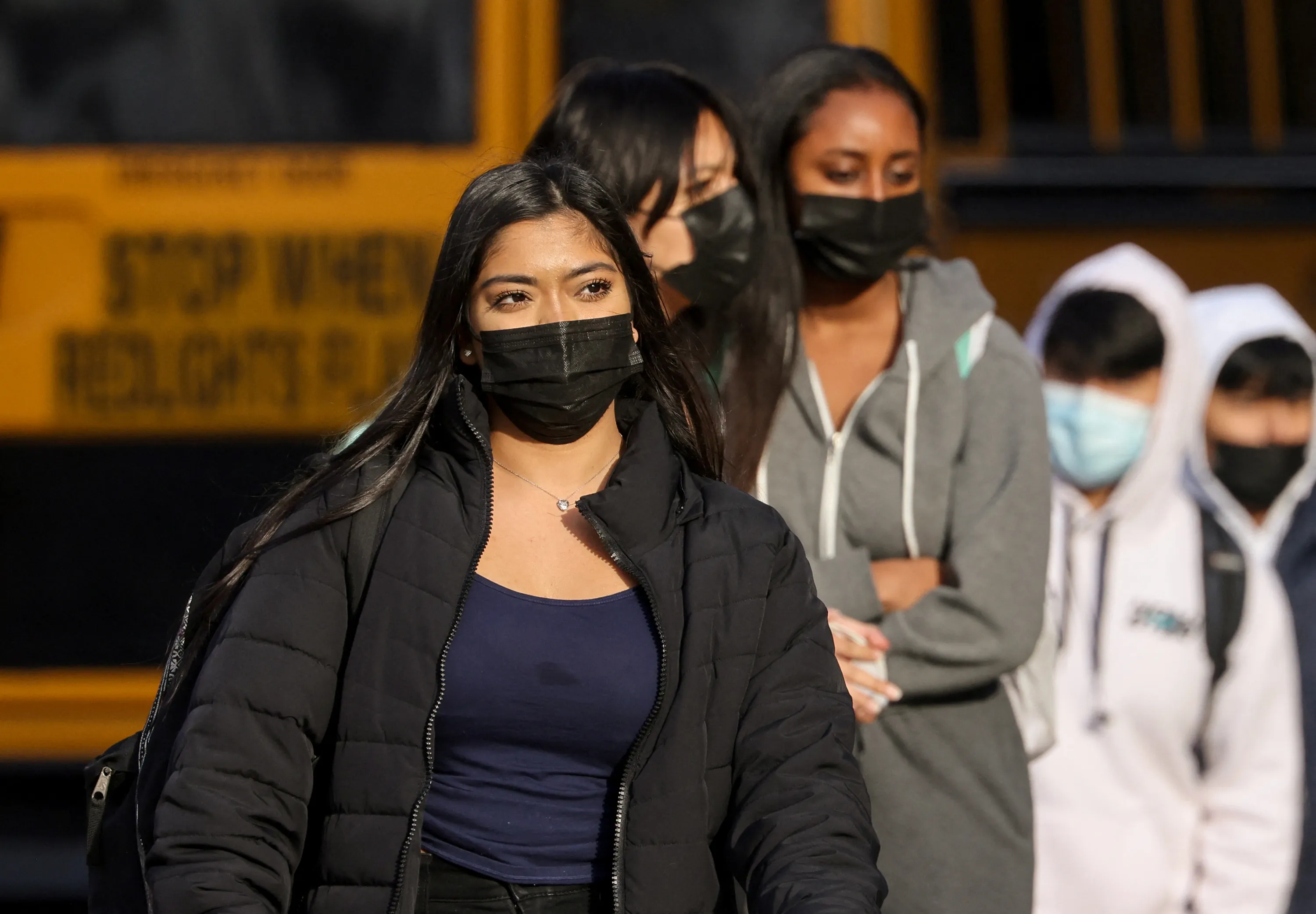 Students leave Washington-Liberty High School in Arlington County which is one of several school districts which sued to stop the mask-optional order by Governor Glenn Youngkin (R), in Arlington, Virginia, U.S., January 25, 2022. (Photo by Evelyn Hockstein/Reuters)