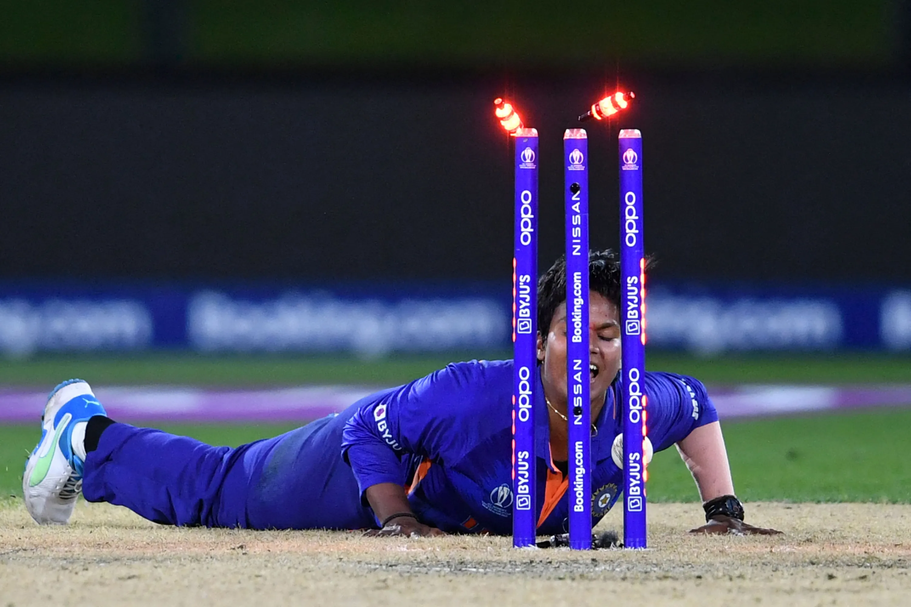 India's Deepti Sharma runs out South Africa's Trisha Chetty during the Women's Cricket World Cup match between South Africa and India at Hagley Oval in Christchurch on March 27, 2022. (Photo by Sanka Vidanagama/AFP Photo)