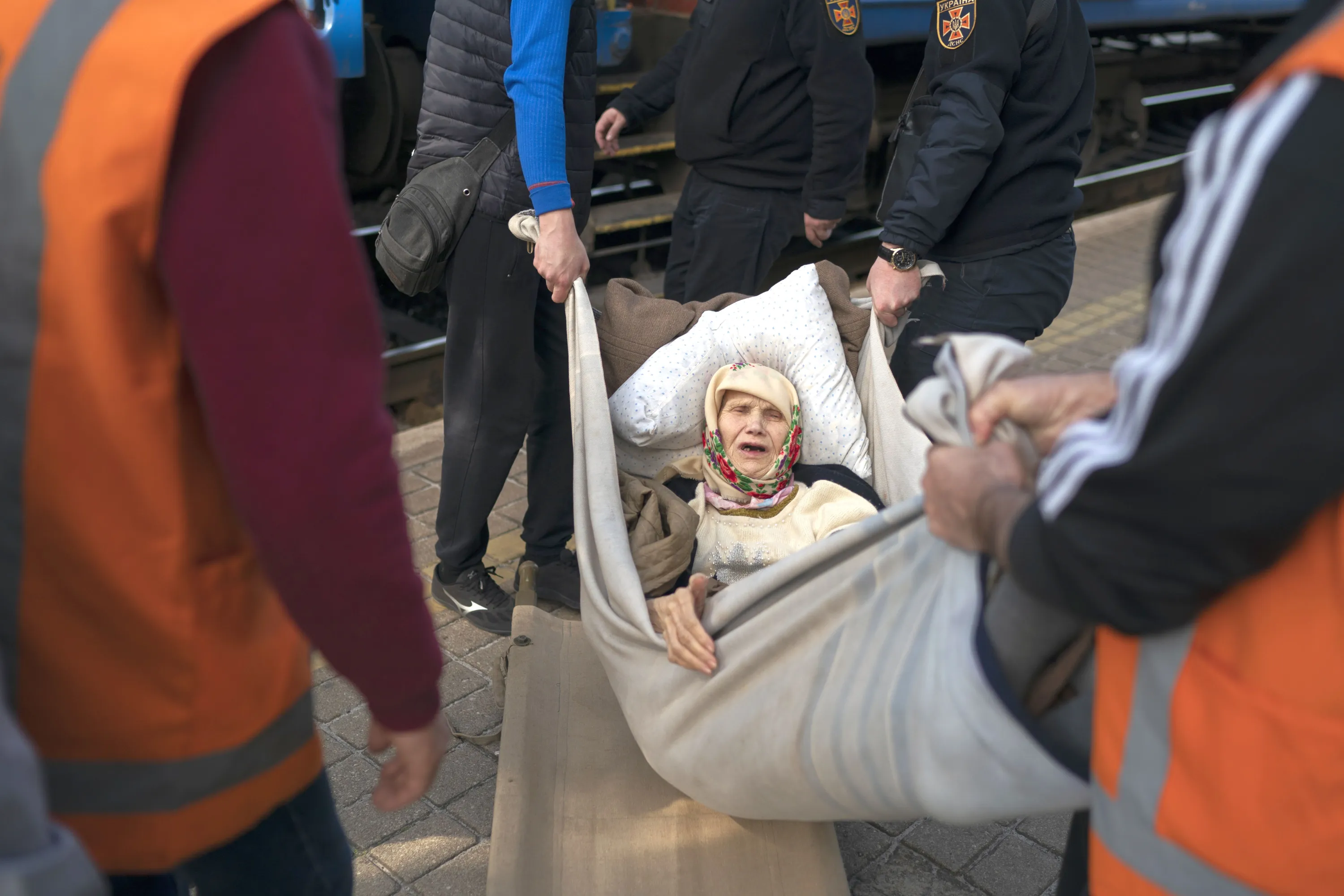 Klavidia, 91, is carried on an improvised stretcher as she boards a train, fleeing the war in Severodonetsk at a train station in Pokrovsk, Ukraine, Monday, April 25, 2022. Russia unleashed a string of attacks against Ukrainian rail and fuel installations Monday, striking crucial infrastructure far from the front line of its eastern offensive. (Photo by Leo Correa/AP Photo)