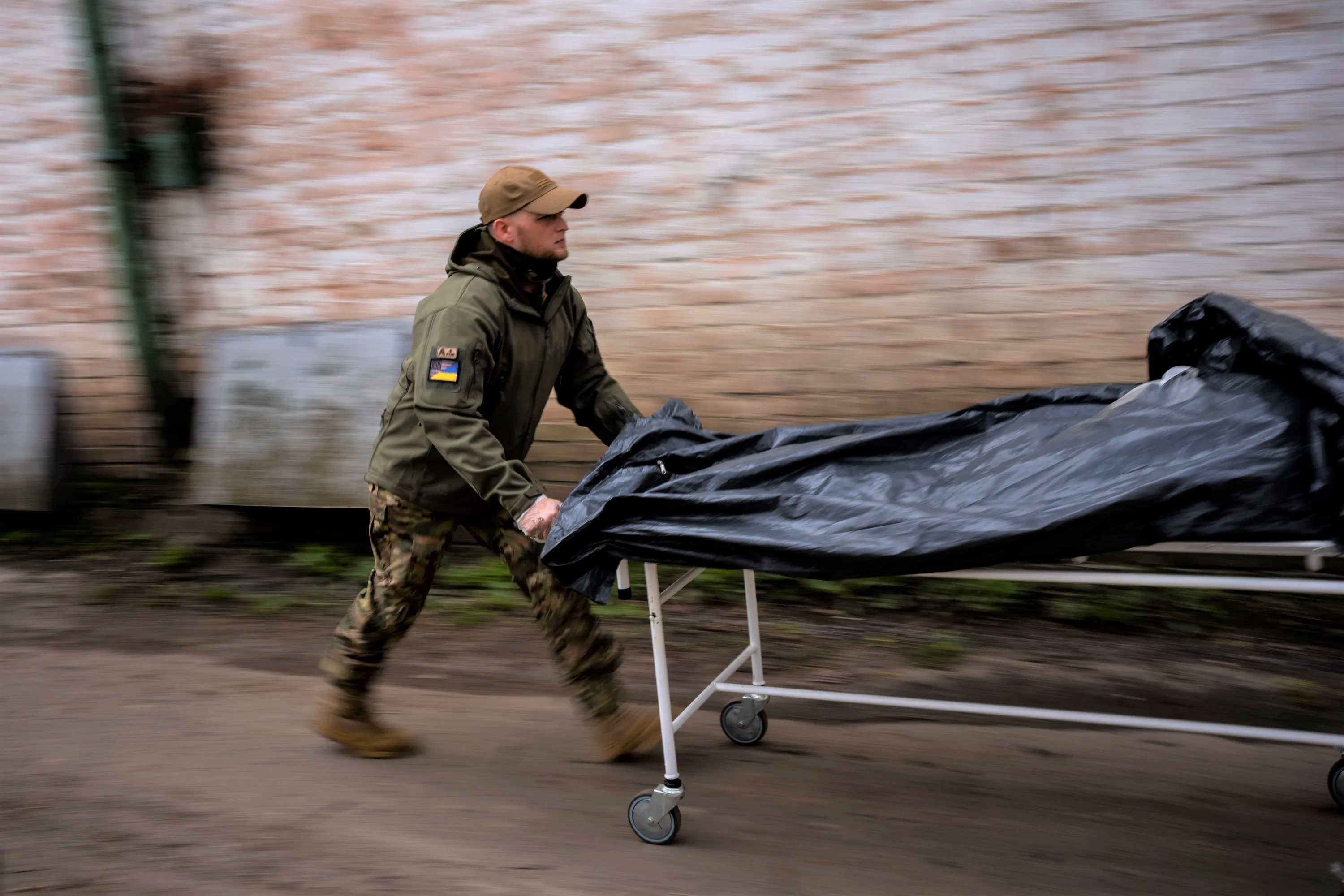 Darrell Loveless works moving dead bodies from refrigerated trucks to the morgue in Bucha, on the outskirts of Kyiv, Monday, April 25, 2022. (Photo by Emilio Morenatti/AP Photo)