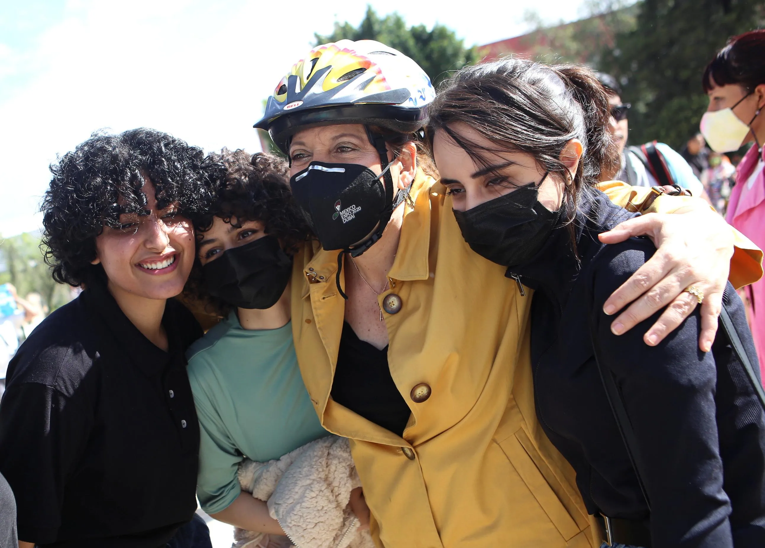 Mexican Deputy Foreign Minister Martha Delgado hugs members of an Afghanistan's robotics team Lida Azizi, Saghar Salehi and Kawsar Roshan, who arrived to Mexico in August, after a bicycle tour in Mexico City, Mexico on September 19, 2021. (Photo by Raquel Cunha/Reuters)