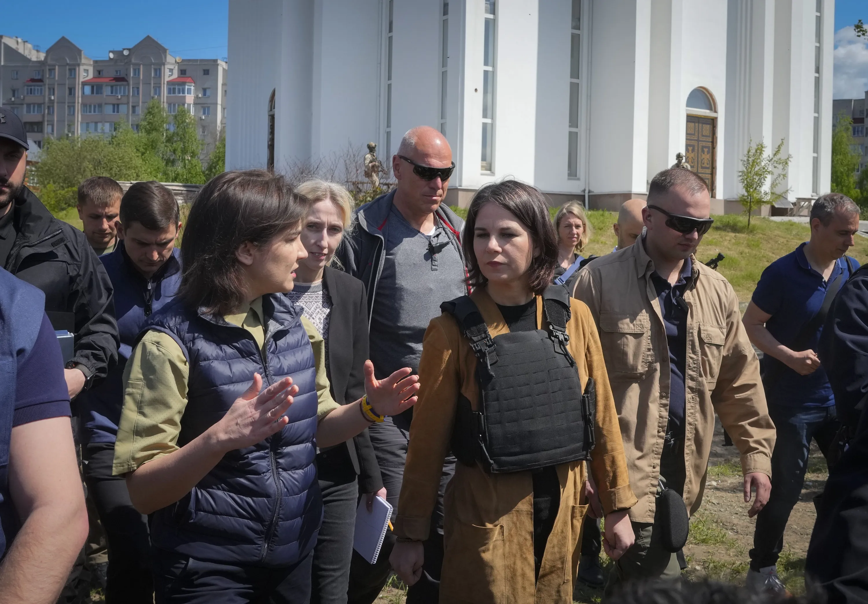 German Foreign Minister Annalena Baerbock, center, and Ukrainian Prosecutor General Iryna Venediktova talk as they stand near a mass grave in Bucha, on the outskirts of Kyiv, Ukraine, Tuesday, May 10, 2022. (Photo by Efrem Lukatsky/AP Photo)