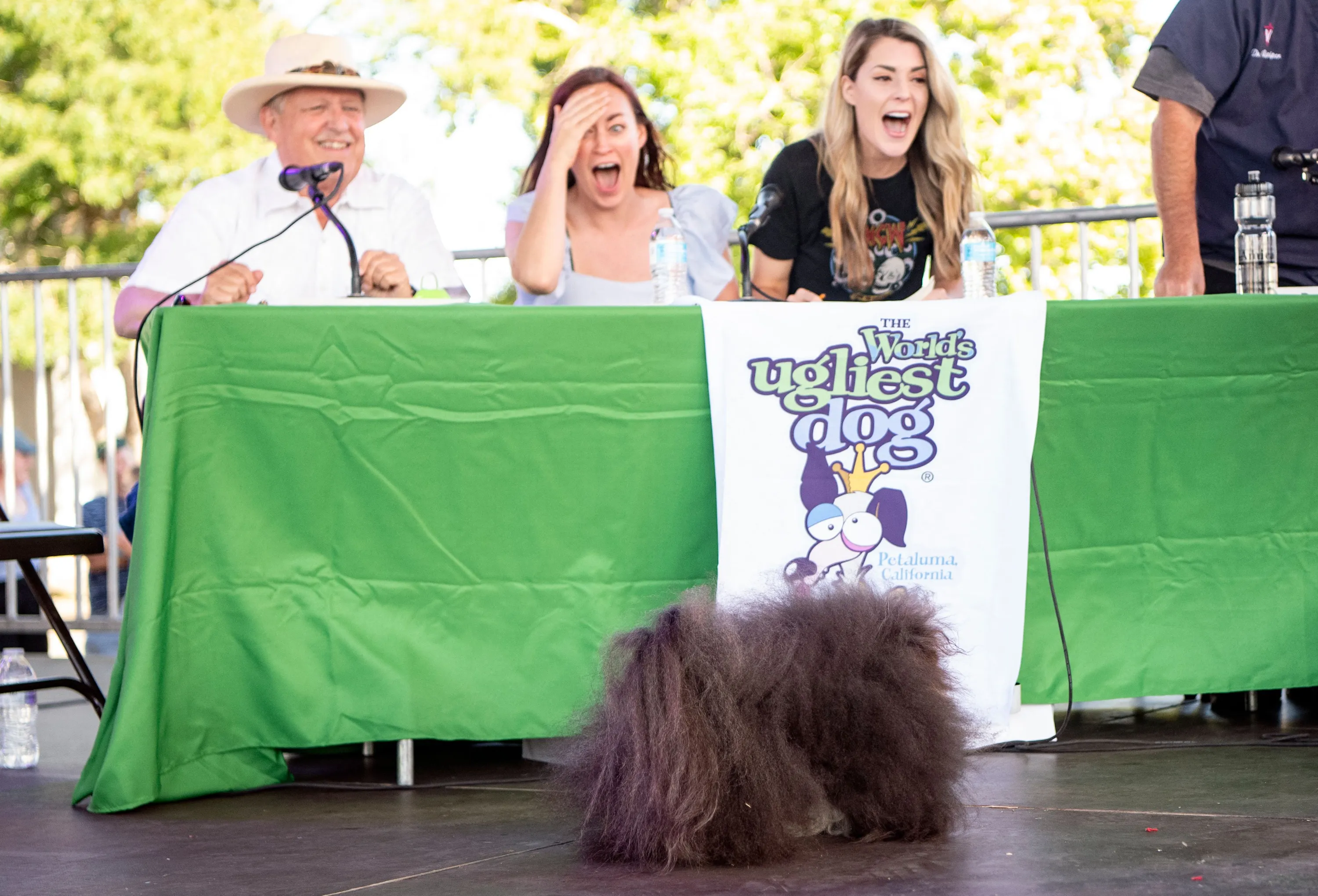 Judges react while Wild Thang takes the stage during the World's Ugliest Dog Competition in Petaluma, California on June 24, 2022. (Photo by Josh Edelson/AFP Photo)