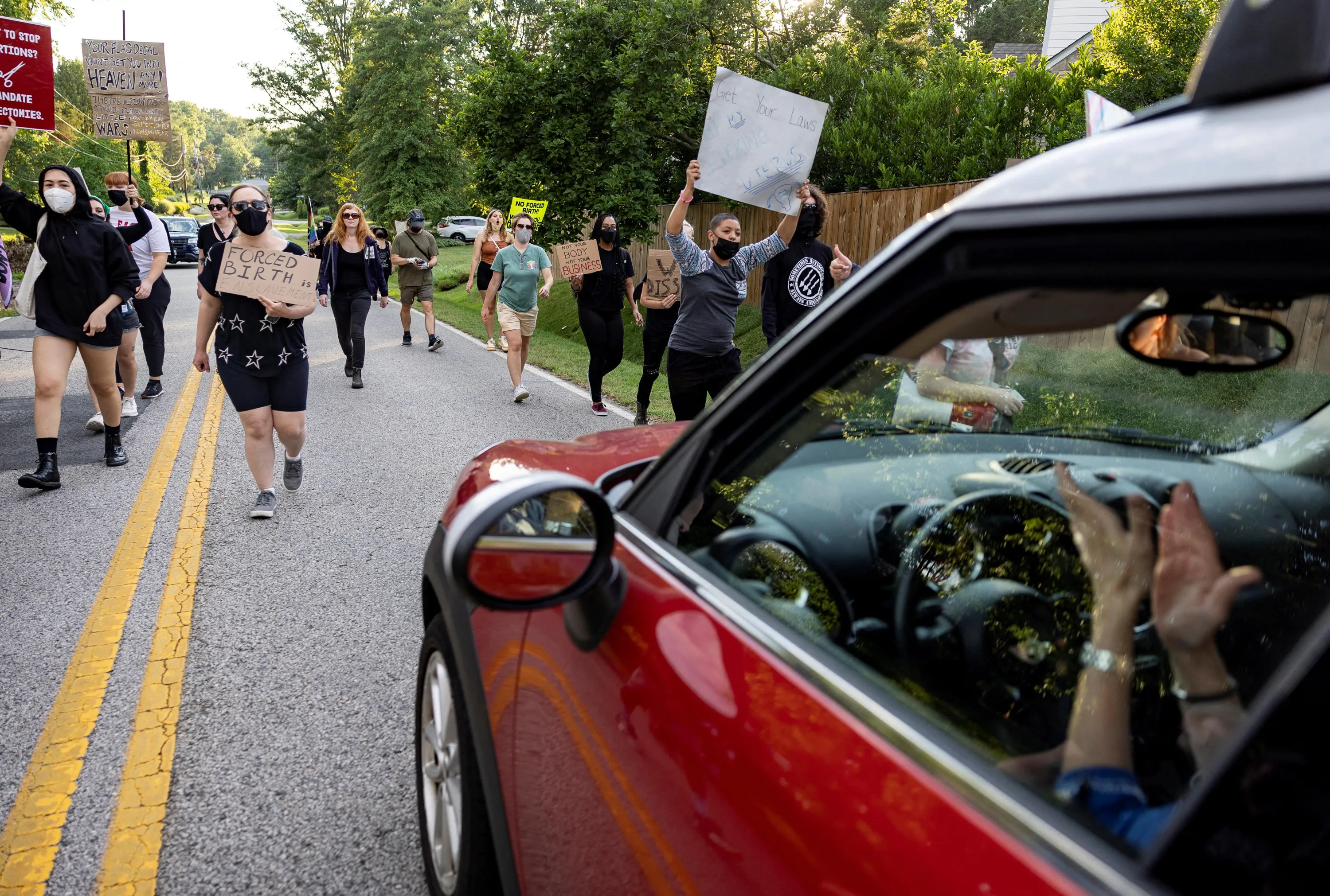 A woman claps in her car as abortion rights activists march to the home of United States Supreme Court Justice Samuel Alito in Alexandria, Virginia, U.S., June 27, 2022. (Photo by Evelyn Hockstein/Reuters)