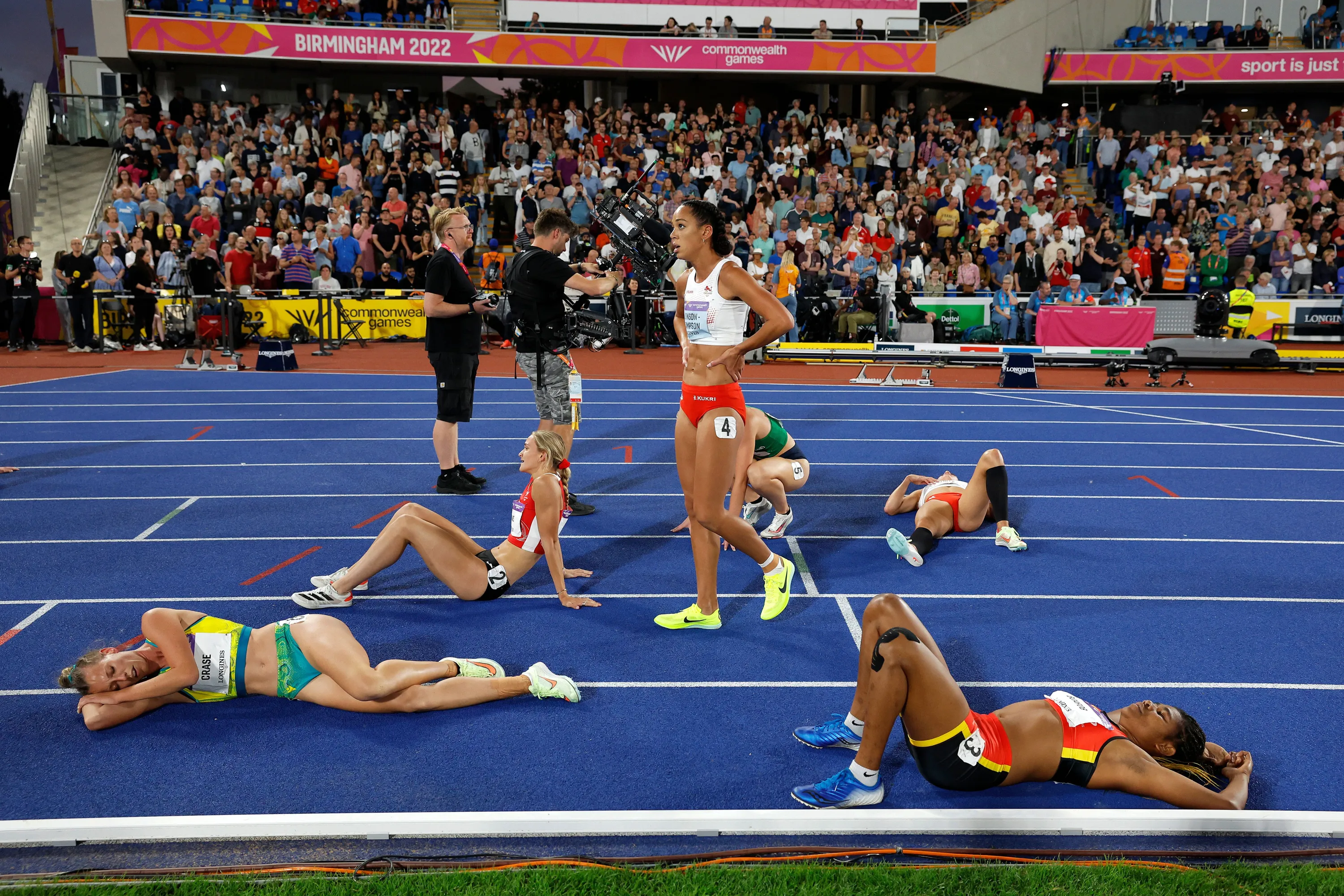 Katarina Johnson-Thompson of Team England recovers following the Women's Heptathlon 800m on day six of the Birmingham 2022 Commonwealth Games at Alexander Stadium on August 03, 2022 in Birmingham, England. (Photo by Tom Jenkins/The Guardian)