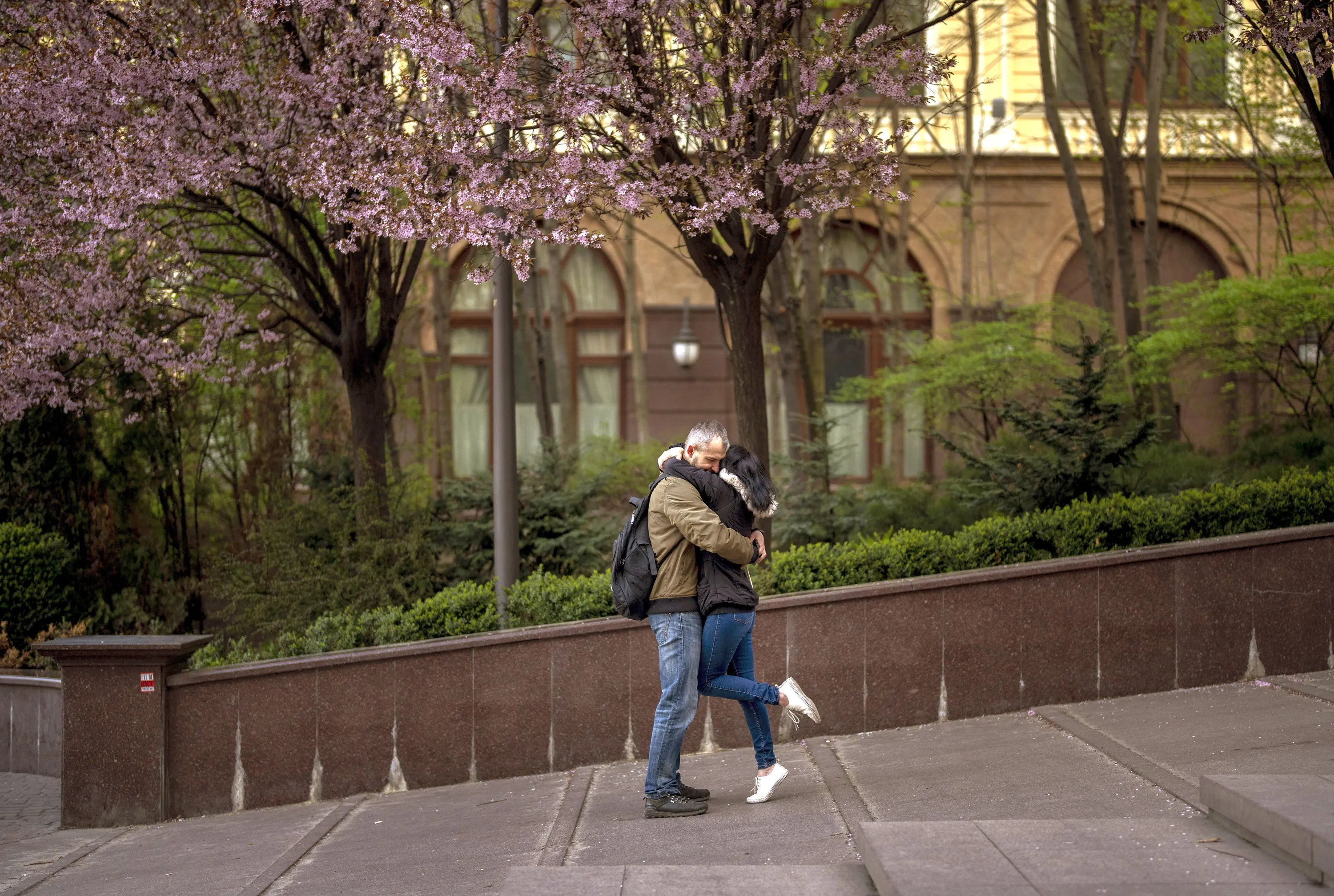 A couple embrace in central Kyiv, on Saturday, April 30, 2022. (Photo by Emilio Morenatti/AP Photo)