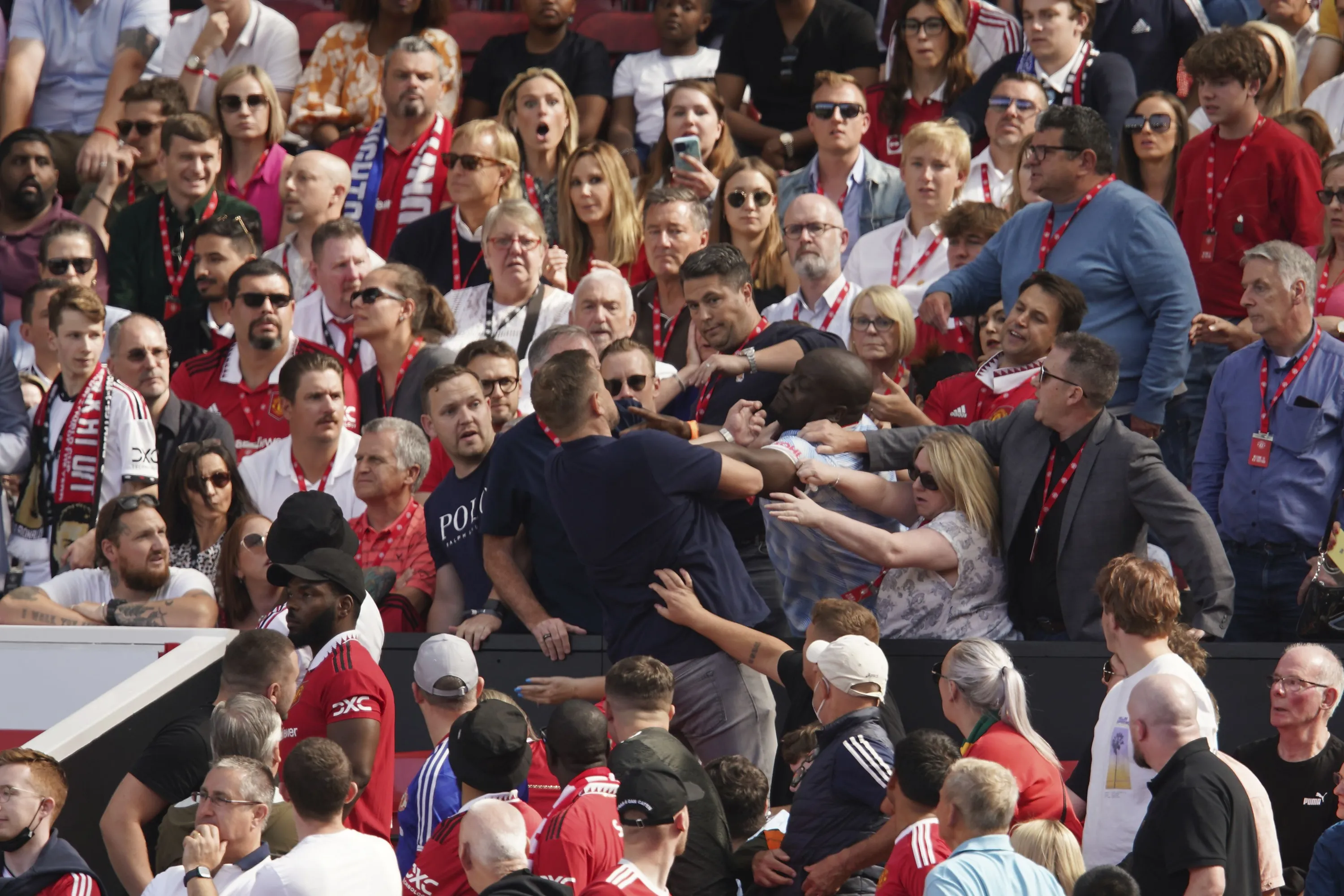 Fans fight on the tribune during the English Premier League soccer match between Manchester United and Brighton at Old Trafford stadium in Manchester, England, Sunday, August 7, 2022. (Photo by Dave Thompson/AP Photo)