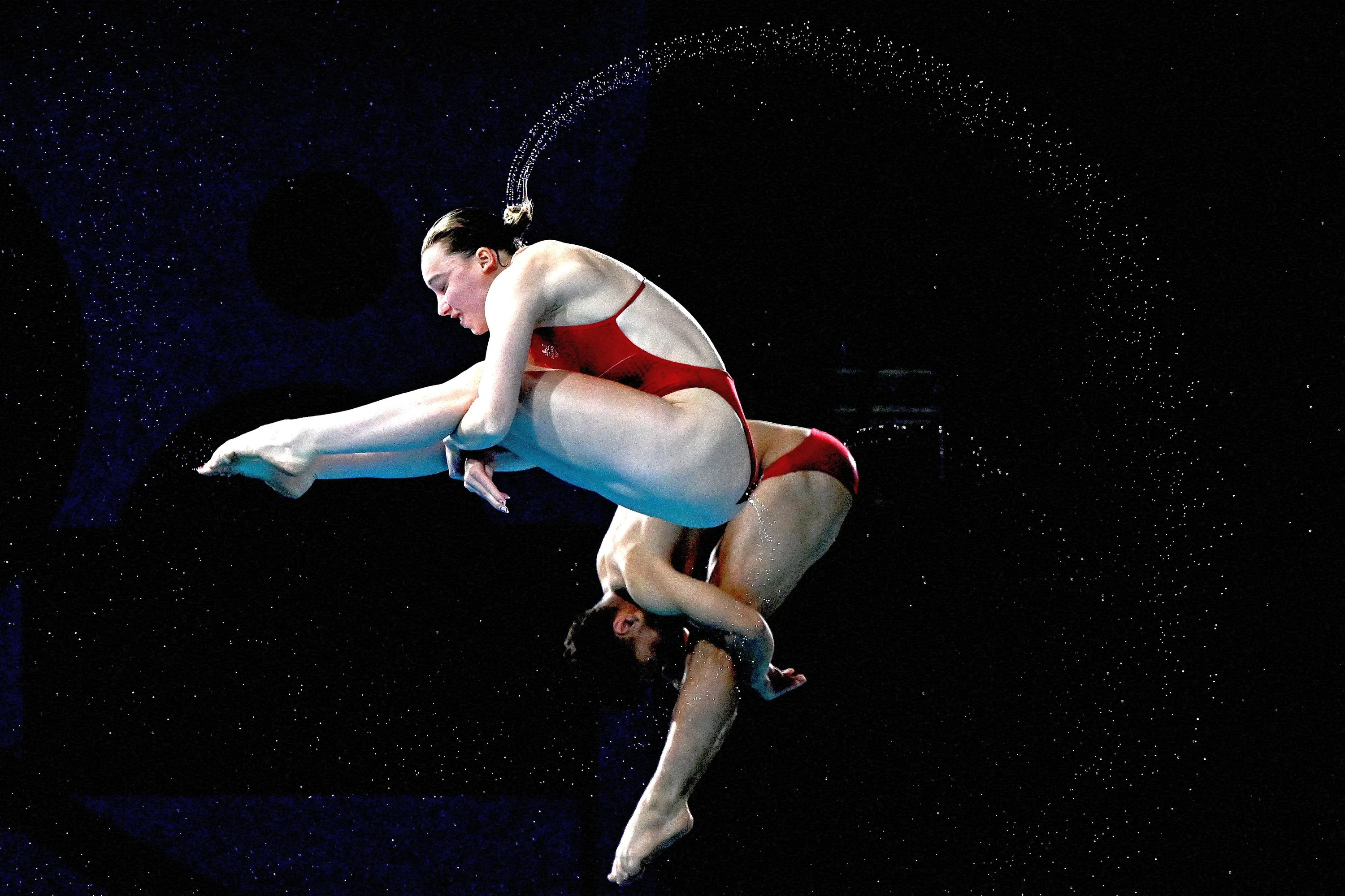 England's Jordan Houlden and England's Yasmin Harper compete during the mixed synchronised 3m springboard diving final on day eleven of the Commonwealth Games at Sandwell Aquatics Centre in Birmingham, central England, on August 8, 2022. (Photo by Oli Scarff/AFP Photo)