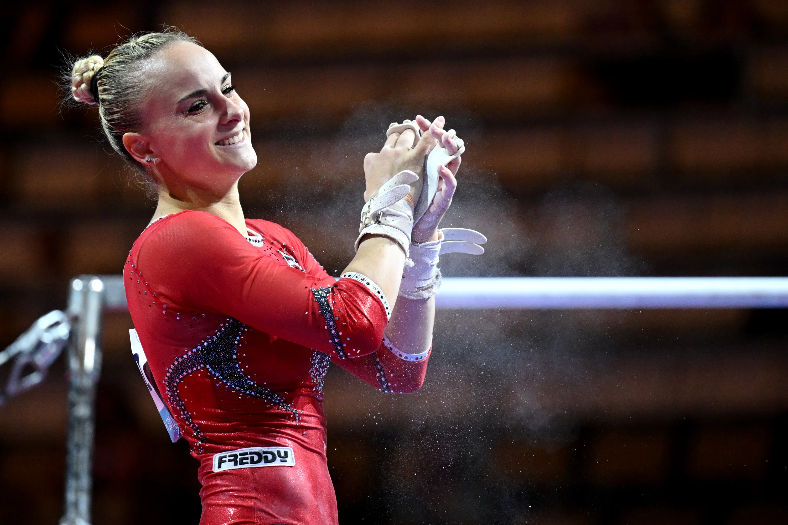 Asia D'Amato of Italy celebrates after competing on the uneven bars during the Women's Artistic Gymnastics Subdivision 4 competition on day 1 of the European Championships Munich 2022 at on August 11, 2022 in Munich, Germany. (Photo by Matthias Hangst/Getty Images)