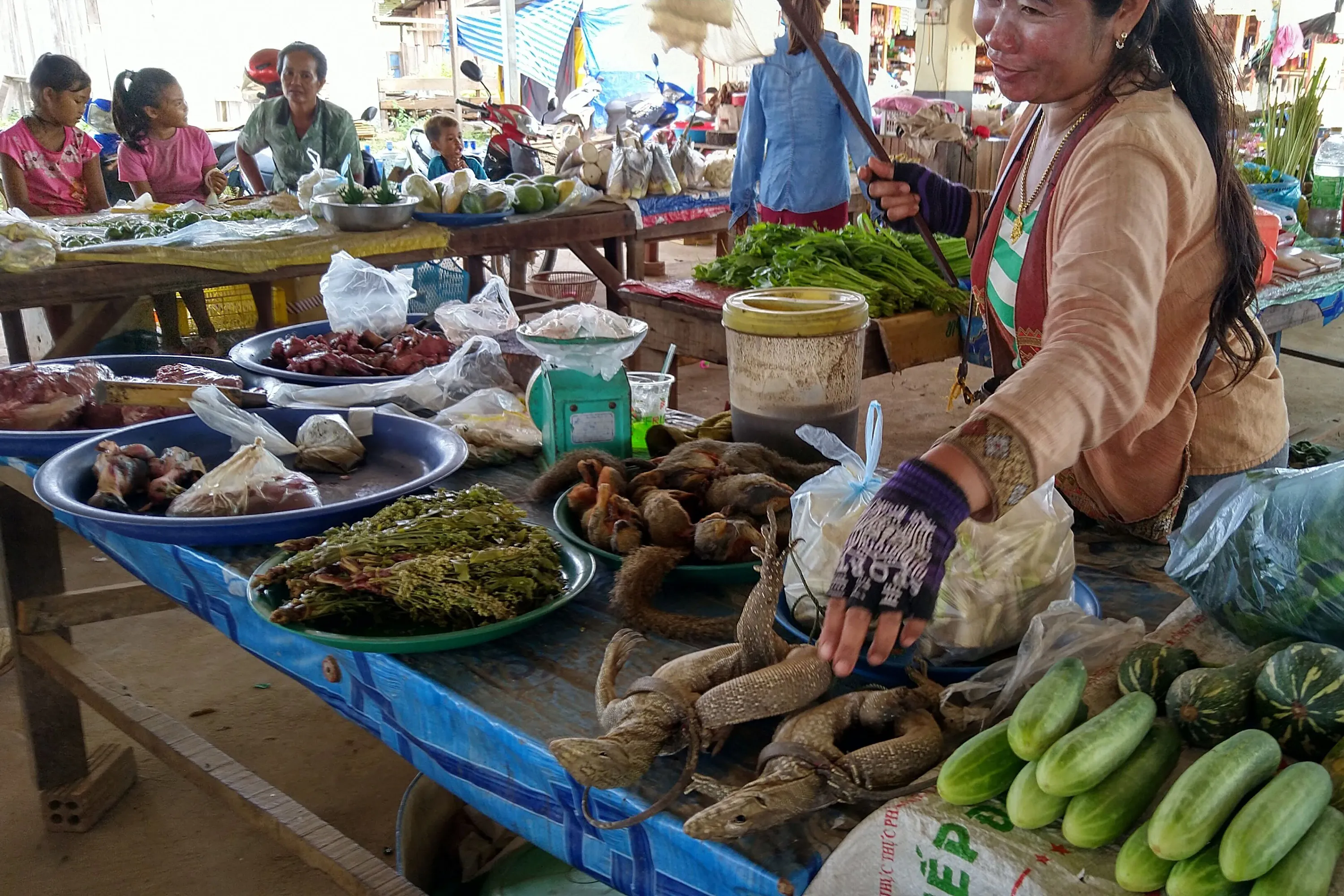 In this undated photo released by the World Wildlife Fund, a woman displays monitor lizards, squirrels and wild birds for sale at an open air market in Attapeu, Laos. A report released by the World Wildlife Fund, Friday, April 1, 2022, shows illegal purchases of wildlife online are growing in Myanmar in a threat both to public health and to endangered species. (Photo by K. Yoganand/World Wildlife Fund via AP Photo)