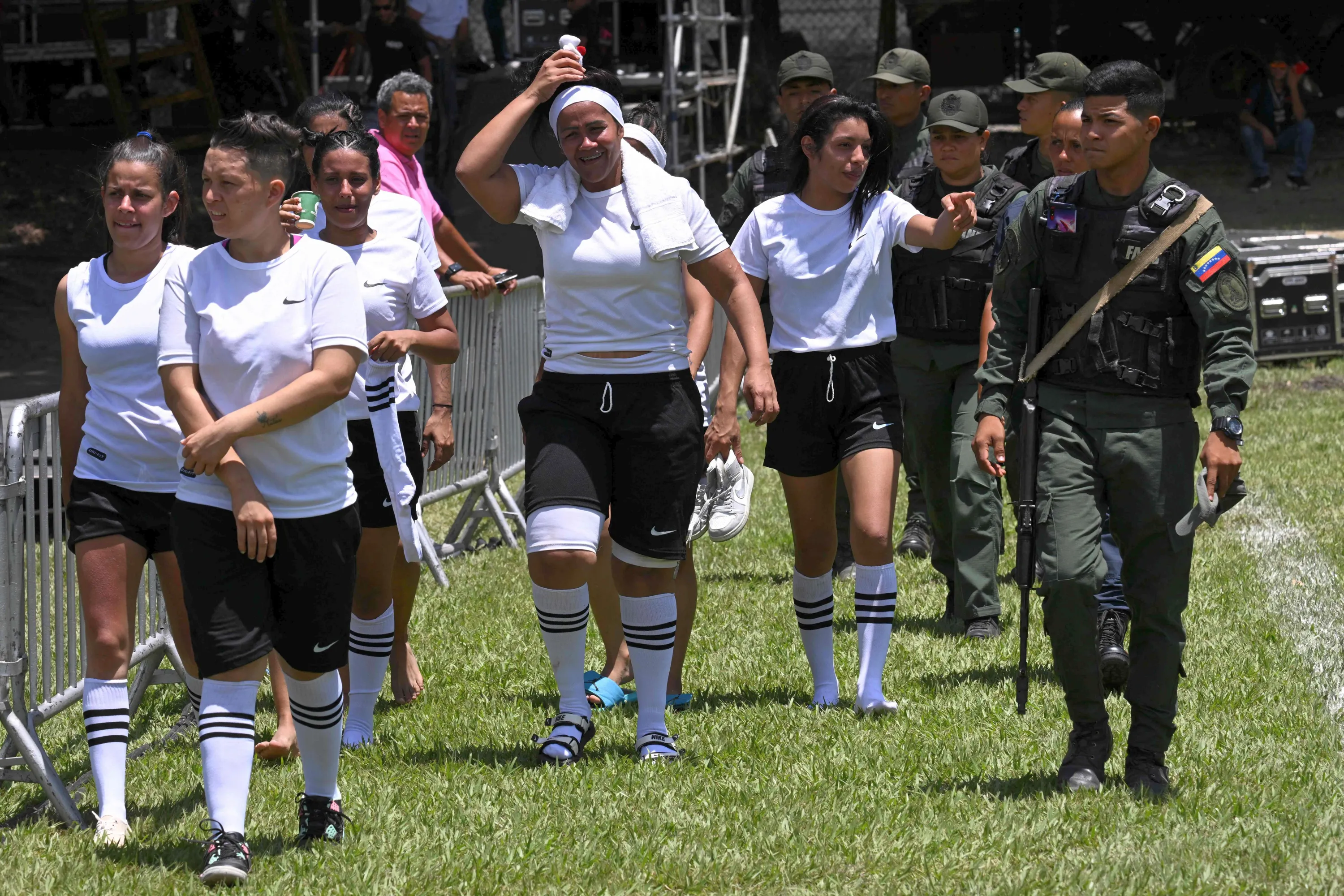 Inmates members of Tocuyito team are escorted by members of the Bolivarian National Guard (GNB) before their Penitentiary Rugby Tournament match organized by the Santa Teresa Foundation at the sports field Hacienda Santa Teresa in El Consejo, Aragua State, Venezuela, on September 1, 2022. For the first time, the Santa Teresa Foundation is organizing a women's prison rugby tournament as part of a program called Alcatraz, which aims to give female prisoners the opportunity to reintegrate into civil society. (Photo by Yuri Cortez/AFP Photo)
