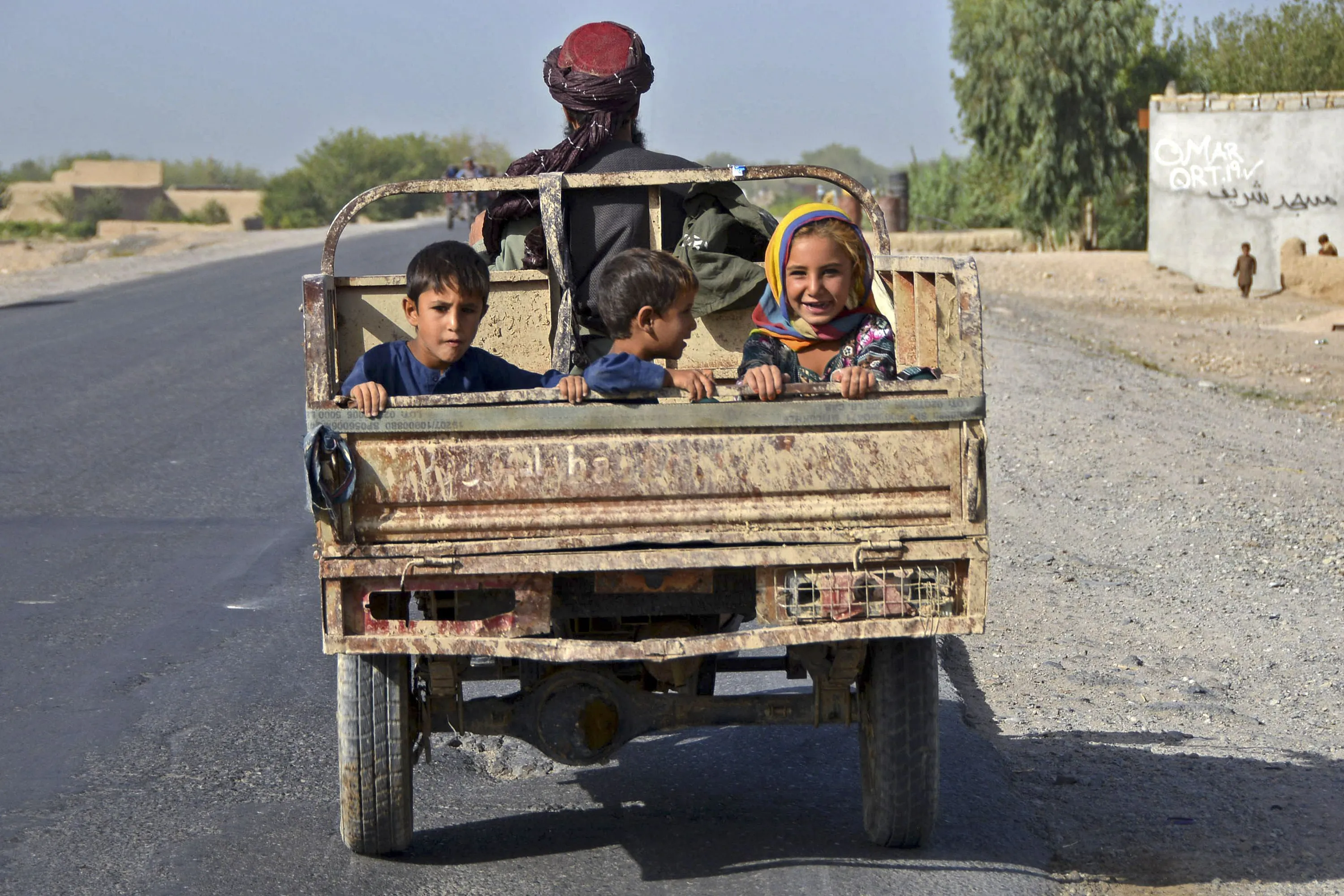 In this photograph taken on August 29, 2022, children travel at the back of a vehicle along a street in Kandahar. (Photo by Javed Tanveer/AFP Photo)