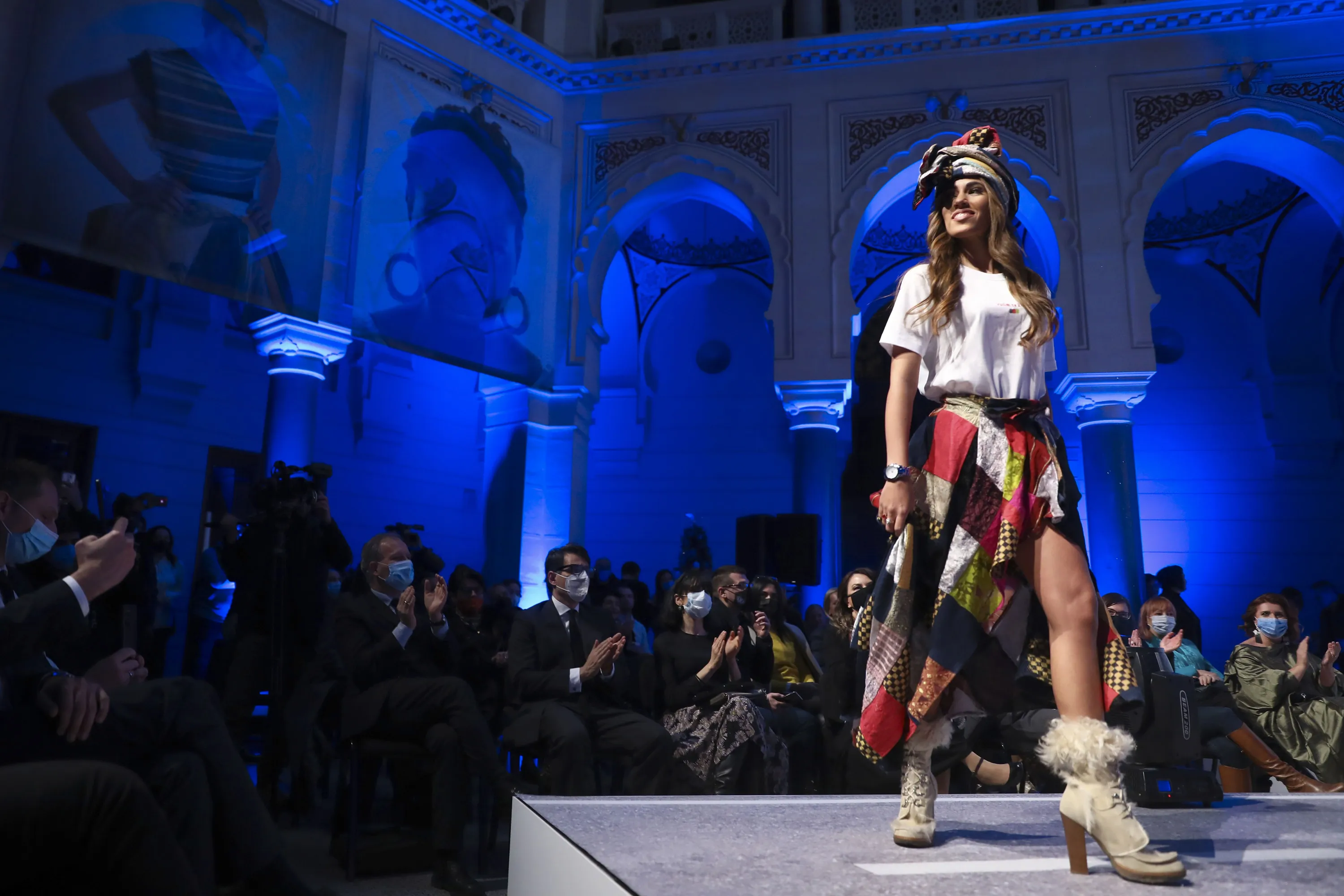 A model takes to the catwalk inside the 19th century building City Hall in Sarajevo, Bosnia, Thursday, December 16, 2021, during the presentation of a collection dubbed “No Nation Fashion”, a migrant-made fashion brand project. At the fashion show migrant models came out on the catwalks in designs meant to symbolize various stages of their journeys – the “nomadic” road away from home and the transit to new lives in new countries while the panel in the background read “We are strong”, and “We smile”. (Photo by AP Photo/Stringer)