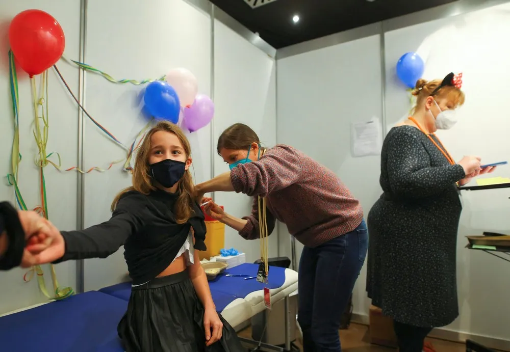 Eleven-year-old Chiara receives a dose of the Pfizer-BioNTech vaccine for children against the coronavirus disease (COVID-19) during a vaccination event for children at the Lanxess Arena in Cologne, Germany, December 18, 2021. (Photo by Thilo Schmuelgen/Reuters)