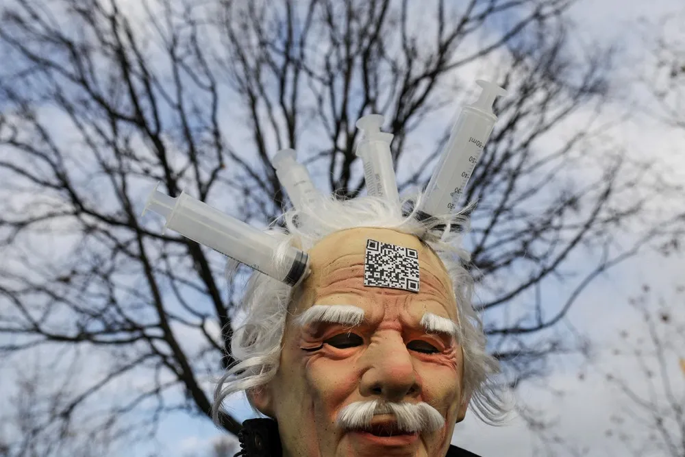 A man wears a mask riddled with syringes during a protest in front of the headquarters of the Romanian Parliament in Bucharest, December 21, 2021, amid the novel coronavirus / Covid-19 pandemic. A couple of thousands of people gather in a protest at the call of nationalist parliamentary party A.U.R. (the Alliace for the Unity of Romanians) against a draft law meant to introduce the Covid-19 “green pass” for the work place. (Photo by Octav Ganea/Inquam Photos via Reuters)