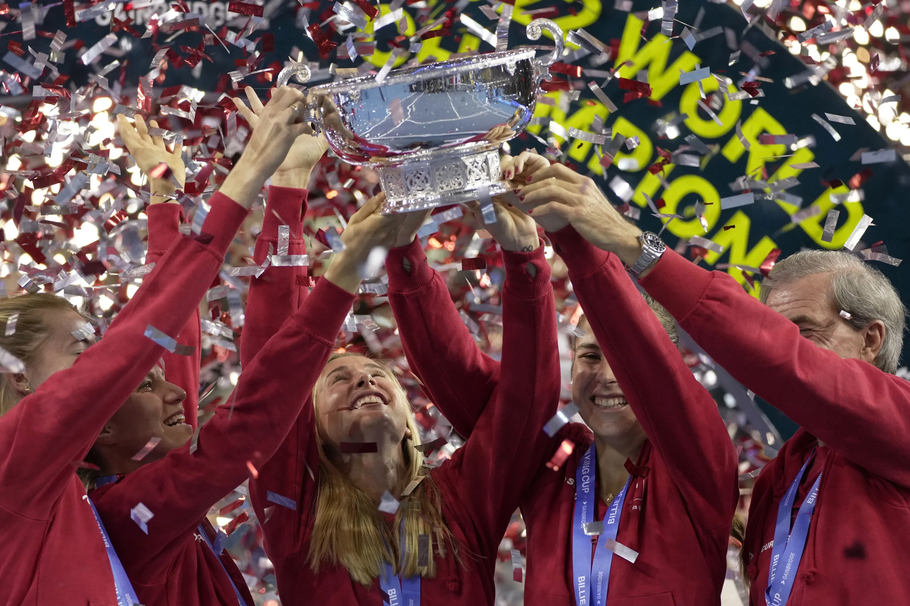 Switzerland's players Simona Waltert, Viktorija Golubic, Jil Teichmann, Belinda Bencic and Switzerland team captain Heinz Guenthardt, from left, celebrate with the trophy after defeating Australia to win the Billie Jean King Cup tennis finals, at the Emirates Arena in Glasgow, Scotland, Sunday, November 13, 2022. (Photo by Kin Cheung/AP Photo)