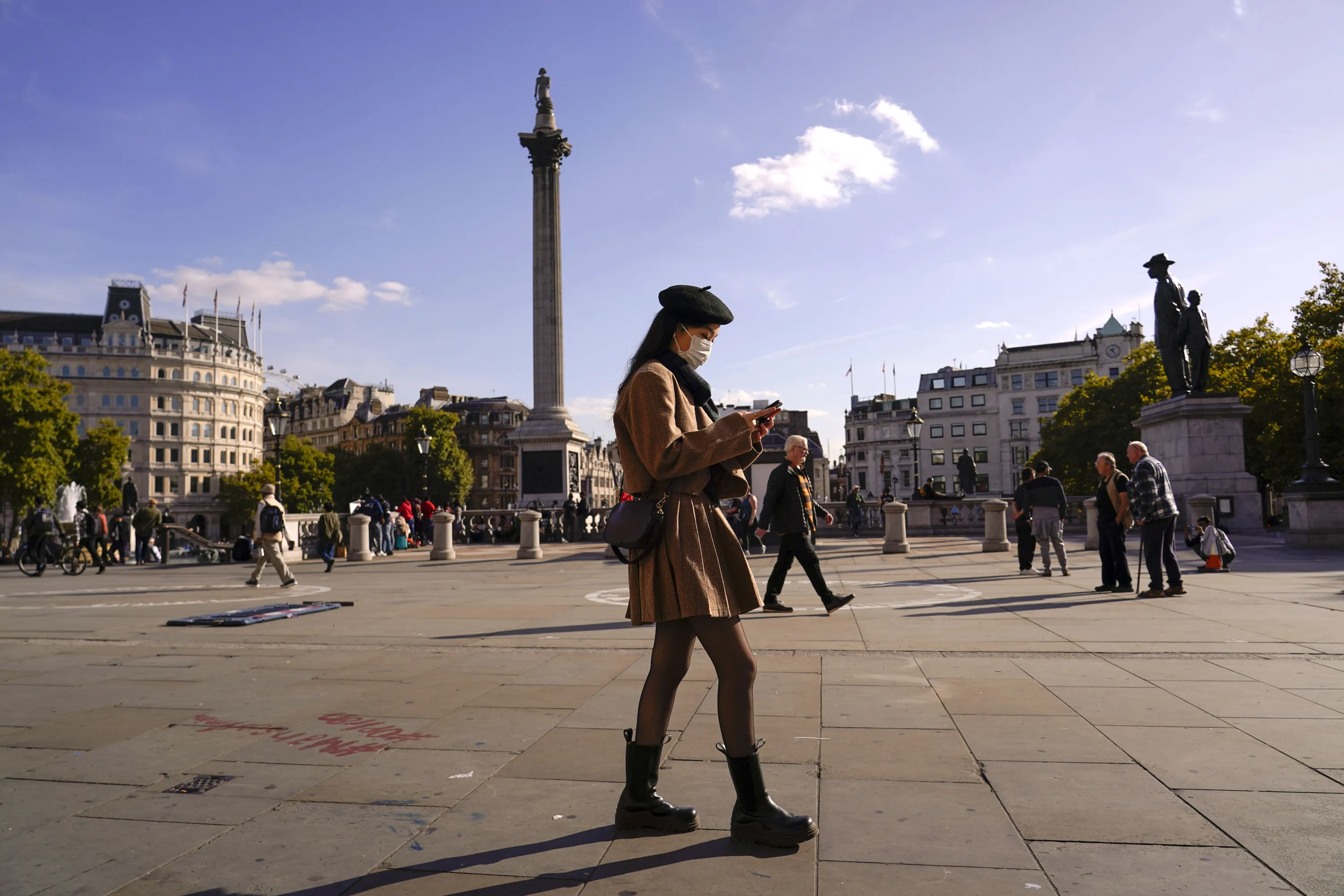 A woman wears a face mask as she walks in Trafalgar Square, in London, Tuesday, October 11, 2022. (Photo by Alberto Pezzali)/AP Photo