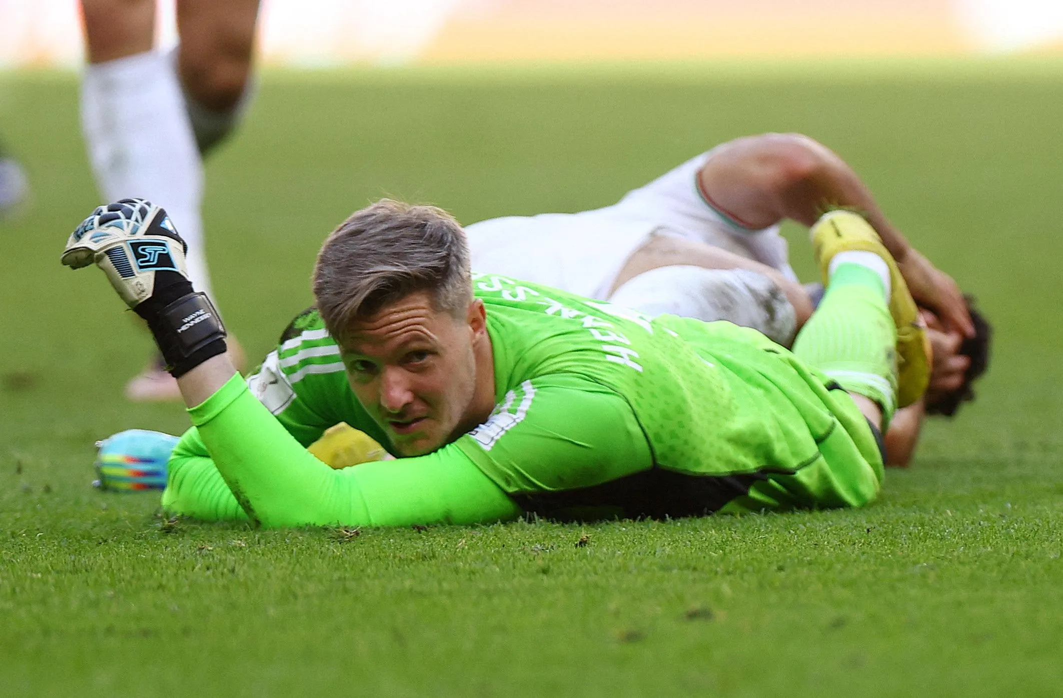 Wayne Hennessey of Wales lays injured after the challenge on Mehdi Taremi of Iran which sees Hennessey sent off 0during the FIFA World Cup Qatar 2022 Group B match between Wales and IR Iran at Ahmad Bin Ali Stadium on November 25, 2022 in Doha, Qatar. (Photo by Hannah Mckay/Reuters)