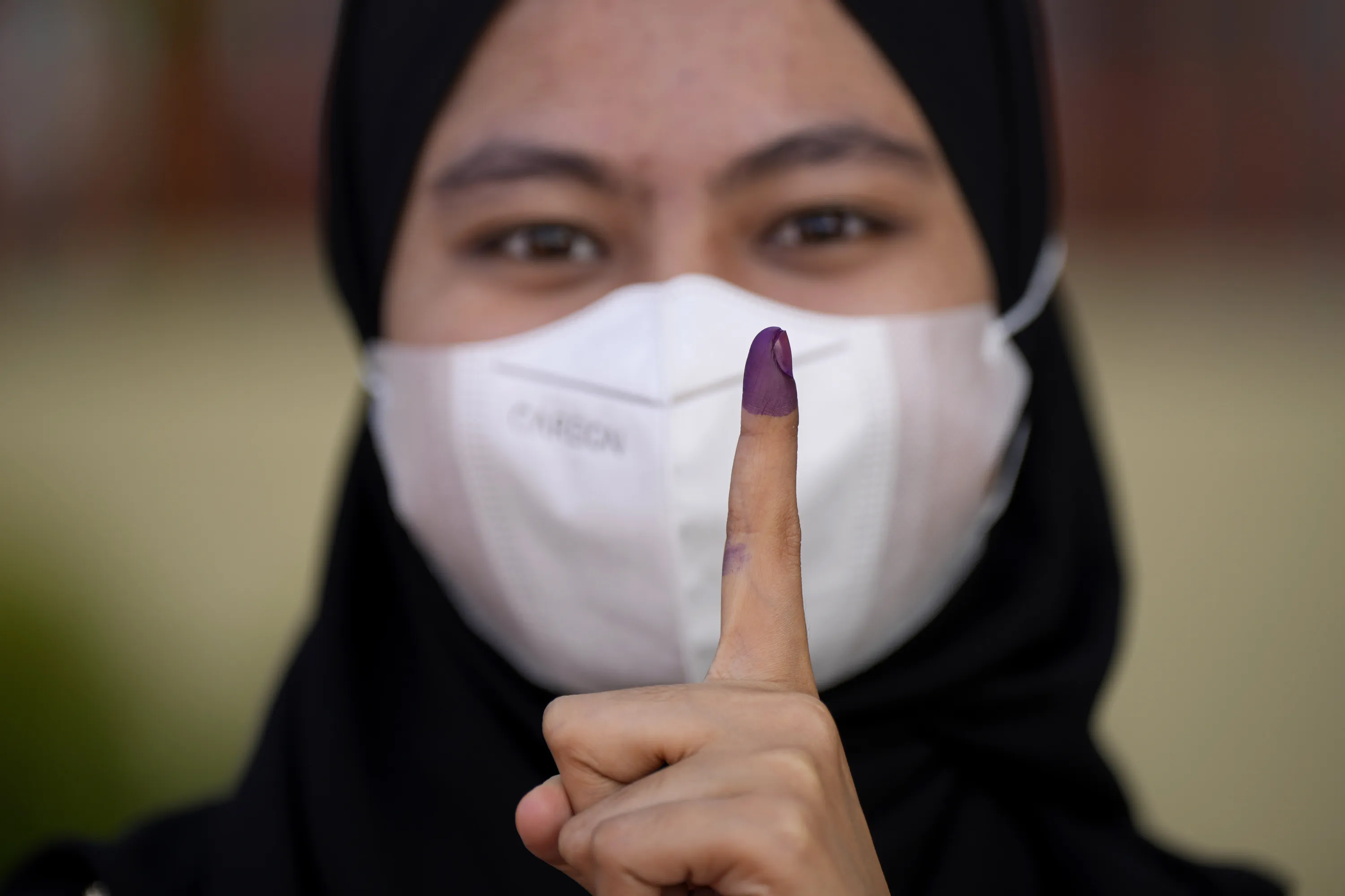 A woman shows her inked finger after voting in Seberang Perai, Penang state, Malaysia, Saturday, November 19, 2022. Malaysians began casting ballots Saturday in a tightly contested national election that will determine whether the country's longest-ruling coalition can make a comeback after its electoral defeat four years ago. (Photo by Vincent Thian/AP Photo)
