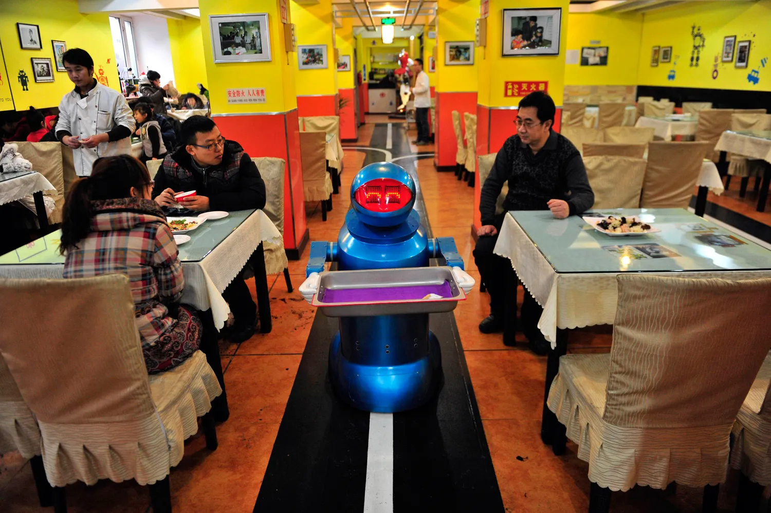 A robot that specialises in delivering food holds an empty plate after serving meals to customers at a Robot Restaurant in Harbin, Heilongjiang province January 12, 2013. Opened in June 2012, the restaurant has gained fame in using a total of 20 robots, which range in heights of 1.3 � 1.6 metres, to cook meals and deliver dishes. The robots can work continuously for five hours after a two-hour charge, and are able to display over 10 expressions on their faces and say basic welcoming sentences to customers, local media reported. (Photo by Sheng Li/Reuters)